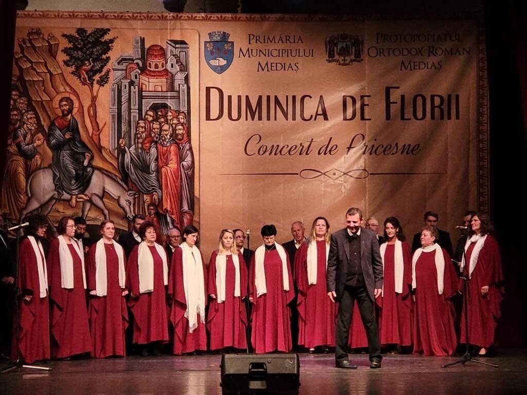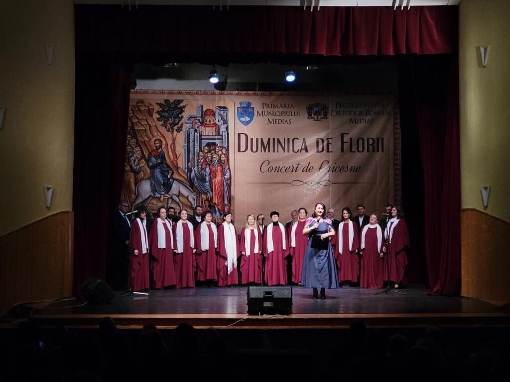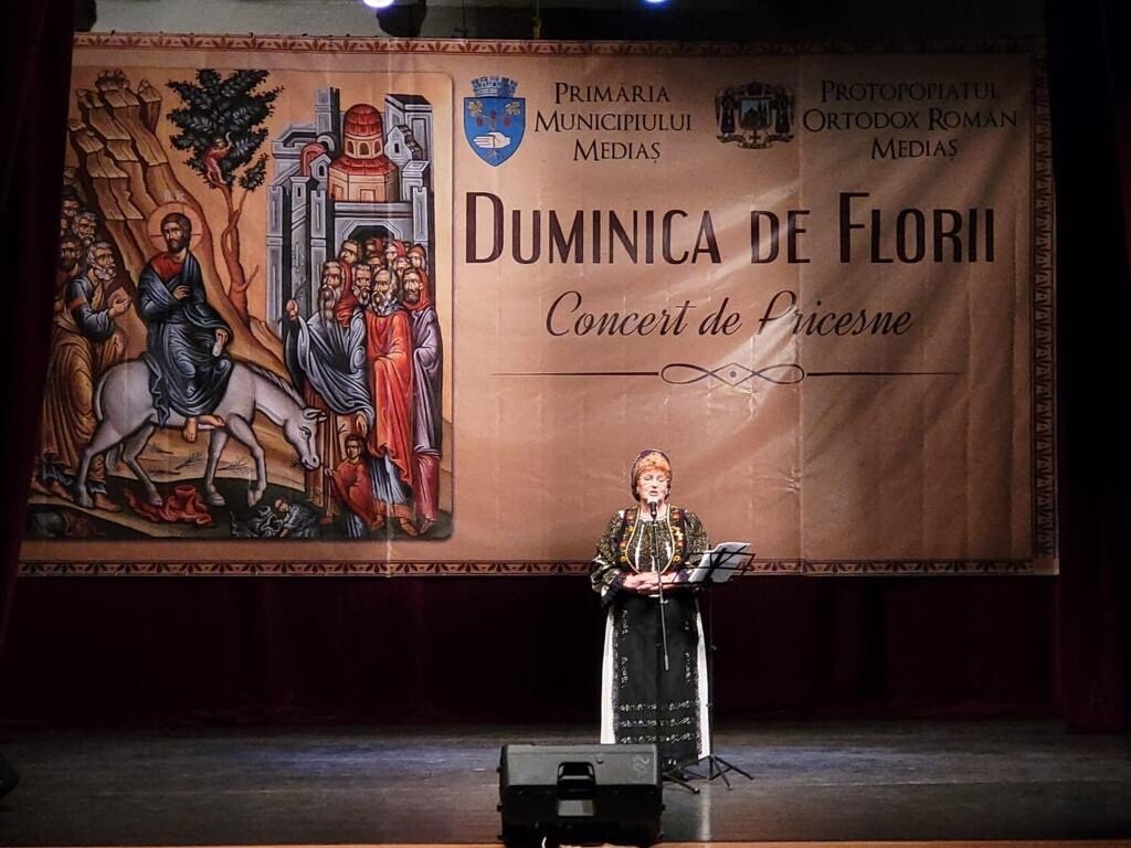 În Duminica Floriilor – 9 aprilie 2023- Primăria Municipiului Mediaș a organizat, alături de Protopopiatul Ortodox Român, un concert de pricesne și cântece religioase specifice acestei importante sărbători. Manifestarea a avut loc la Sala Traube, de la ora 19:00, pe scenă fiind prezenți soliștii vocali Emilia Muntean, Aurelian Suciu, Luminița Dejan și Costel Popa, alături de invitații speciali ai evenimentului – Oana Bozga – Pintea și Veta Biriș.