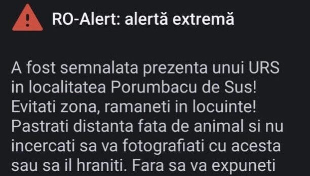 Astfel, a fost transmis mesaj RO-ALERT cetățenilor din zona în care a fost semnalată prezența animalului.