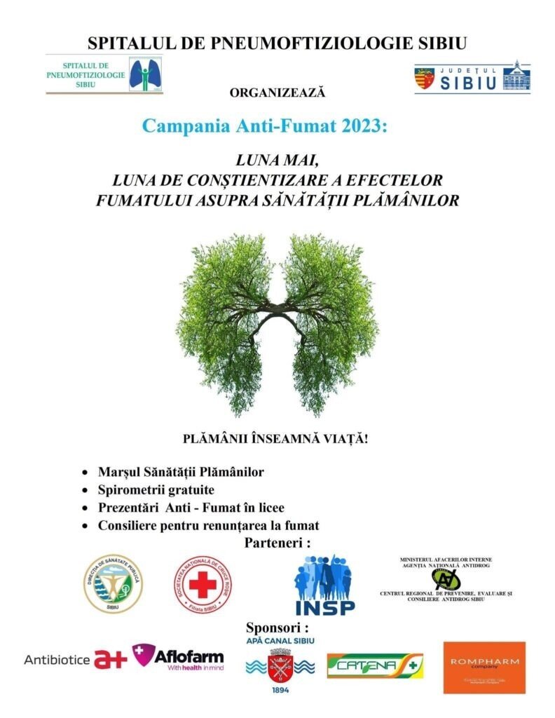 Cea de-a șasea ediție a campaniei antifumat, inițiată de Spitalul de Pneumoftiziologie Sibiu, intitulată „Luna mai, luna de conștientizare a efectelor fumatului asupra sănătății plămânilor”, a debutat marți, 2 mai, cu o acțiune de conștientizare a elevilor de la Liceul „Onisifor Ghibu”, derulată împreună cu reprezentanți ai Centrului Antidrog Sibiu.