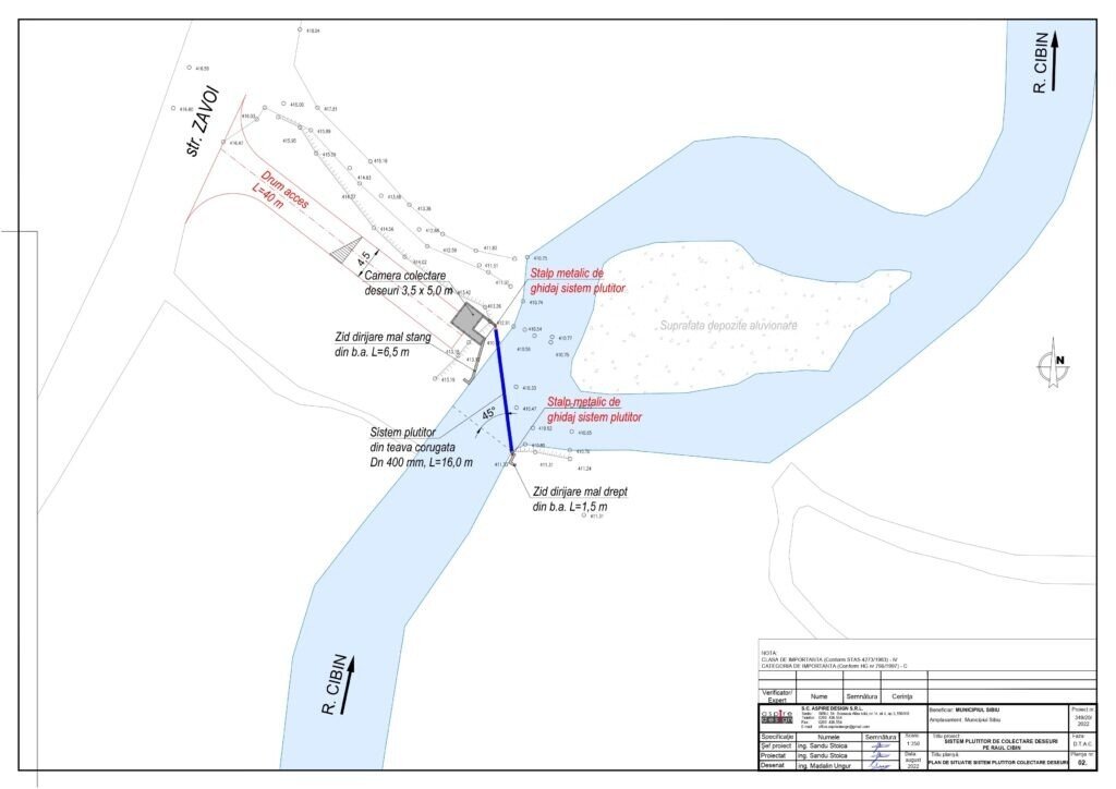 • Realizarea sistemului plutitor de colectare a deșeurilor în lungime de 16 m. Conducta se va instala perpendicular la un unghi de 45 grade pe râul Cibin pentru dirijarea deșeurilor și algelor către camera de colectare.