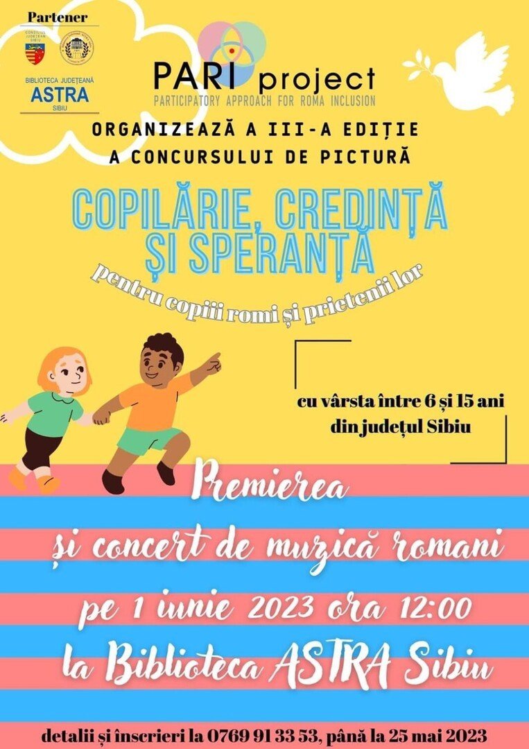 PARI project, în parteneriat cu Inspectoratul Școlar Sibiu, Biblioteca Județeană ASTRA Sibiu și Asociația Studia Oecumenica, organizează a treia ediție a concursului de pictură și desen dedicat copiilor romi și prietenilor lor intitulat „Copilărie, credință și speranță”.