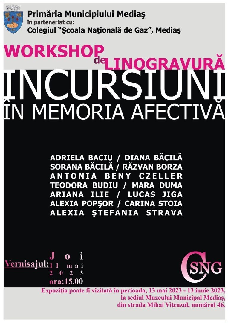 Primăria Municipiului Mediaș, prin Direcția pentru Cultură, organizează la sediul Muzeului Municipal Mediaș expoziția temporară de linogravură „INCURSIUNI în memoria afectivă“, realizată în parteneriat cu Colegiul „Școala Națională de Gaz” Mediaș. Vernisajul expoziției va avea loc joi, 11 mai, ora 15:00.