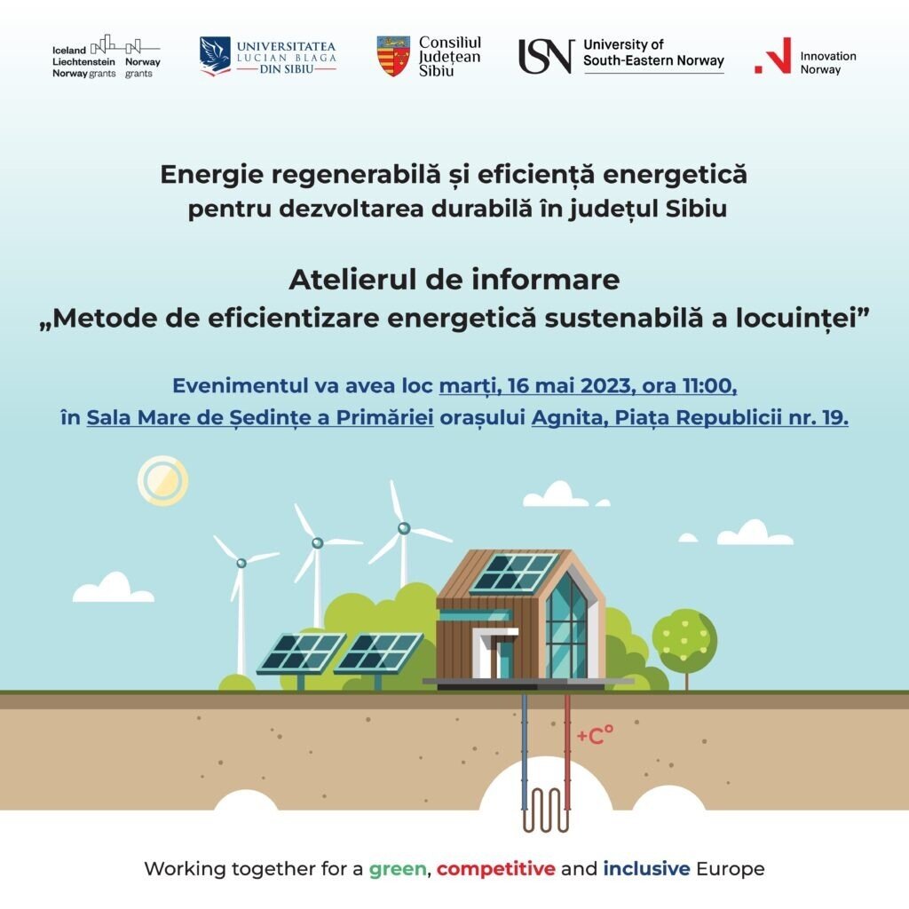 Consiliul Județean Sibiu împreună cu partenerii săi, Universitatea „Lucian Blaga” din Sibiu și University of South-Eastern Norway invită locuitorii orașului Agnita marți, 16 mai 2023, ora 11.00 la un atelier de informare, privind metodele de eficientizare energetică sustenabilă. Scopul principal al evenimentului este de a oferi o mai bună înțelegere a beneficiilor energiei regenerabile și a impactului acesteia în eficiența energetică. Partenerii din mediul academic vor oferi detalii despre eficientizarea sustenabilă a locuinței, precum și ce soluții există, modul în care ajută în viitor, dar și exemple de bună practică.
