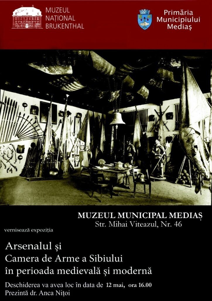 Primăria Municipiului Mediaș, prin Direcția pentru Cultură, în parteneriat cu Muzeul Național Brukenthal Sibiu, organizează la sediul Muzeului Municipal Mediaș expoziția temporară „Arsenalul și Camera de Arme a Orașului Sibiu în perioada medievală și modernă (secolele XV -XIX)”. Vernisajul expoziției va avea loc vineri, 12 mai, ora 16:00. Expoziția va fi deschisă la sediul Muzeului Municipal, Str. M. Viteazu, Nr. 46, în perioada 13 mai – 27 octombrie 2023.