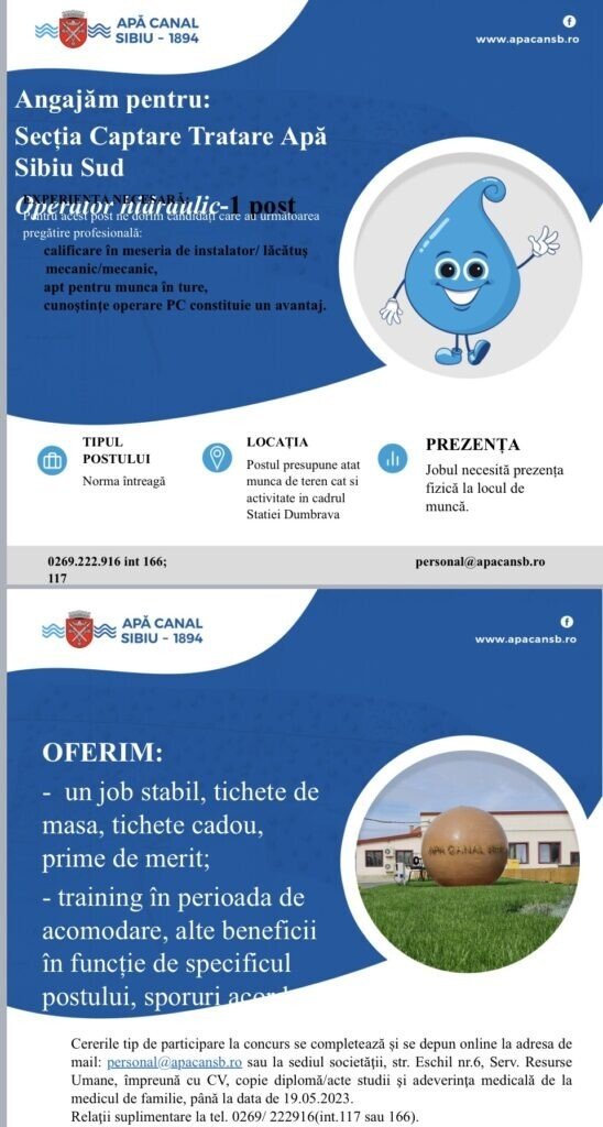 Cererile tip de participare la concurs se completează și se depun online la adresa de mail personal@apacansb.ro sau la sediul societăţii, str. Eschil nr.6, Serv.Resurse Umane, împreună cu CV, copie diplomă studii şi adeverinţa medicală de la medicul de familie, până la data de 19.05.2023. Relaţii suplimentare la tel. 0269/ 222916(int.117 sau 166).