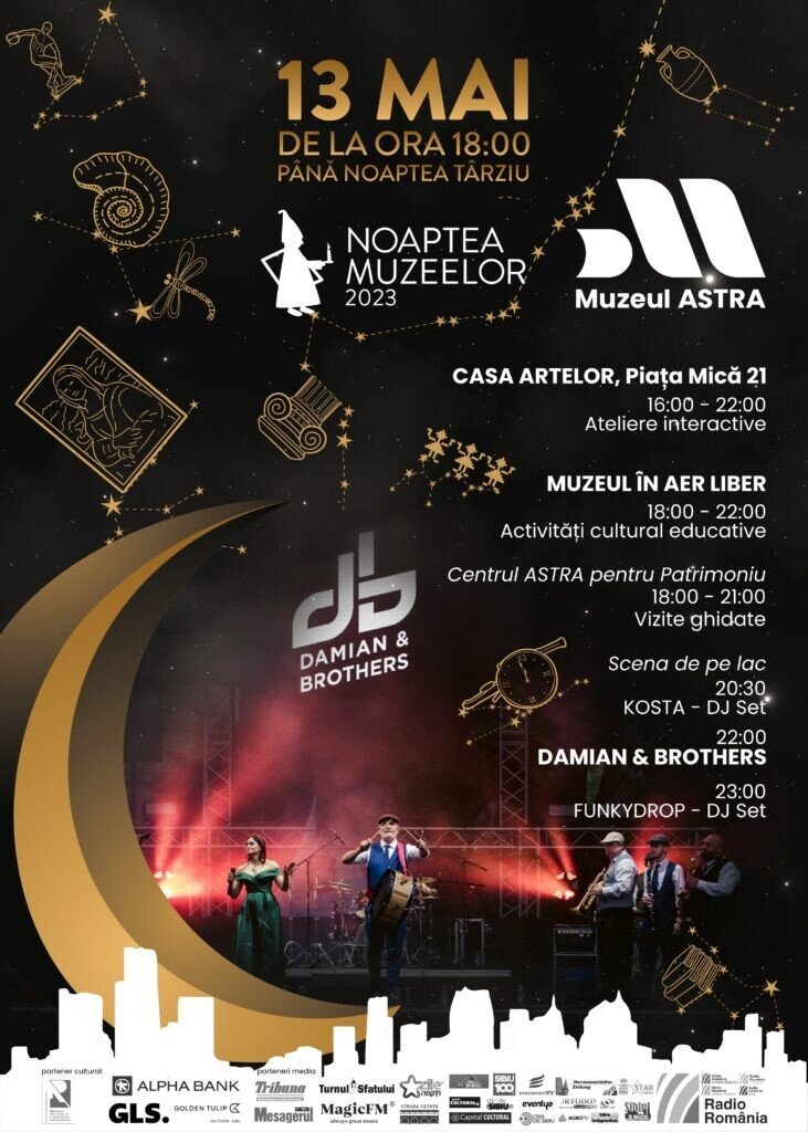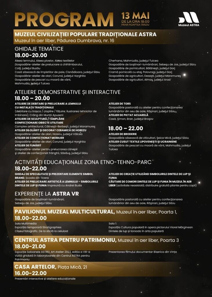 Muzeul ASTRA, instituție ale cărei acțiuni sunt posibile prin finanțarea Consiliului Județean Sibiu, găzduiește sâmbătă, 13 mai 2023, evenimentul Noaptea Muzeelor, ediția a XIX-a. Tema abordată în ediția din acest an va fi ,,Muzeele, sustenabilitatea si starea de bine”. În acest scop, la Muzeul ASTRA vor fi organizate 15 ghidaje, 9 ateliere meșteșugărești interactive, 7 ateliere educaționale creative, 5 expoziții, un concert Damian&Brothers și sesiuni DJ ținute de Kosta& Funkydrop pe scena de pe lac. Activitățile din program sunt cuprinse între orele 18:00 – 00:30. Momentul este unul foarte important în istoria Muzeului ASTRA, fiindcă va fi lansat noul brand și noua identitate vizuală a instituției.