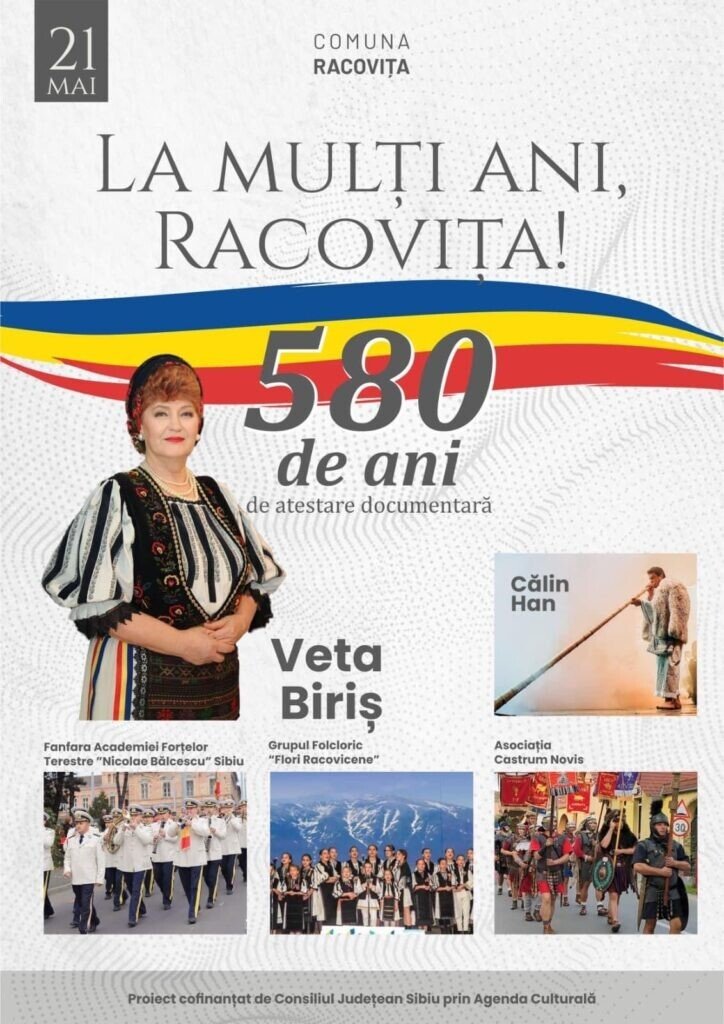 Primăria și Consiliul Local Racovița, în parteneriat cu Consiliul Județean Sibiu prin Agenda Culturală, organizează Duminică, 21 mai 2023, manifestări religioase, culturale și artistice prilejuite de această aniversare.