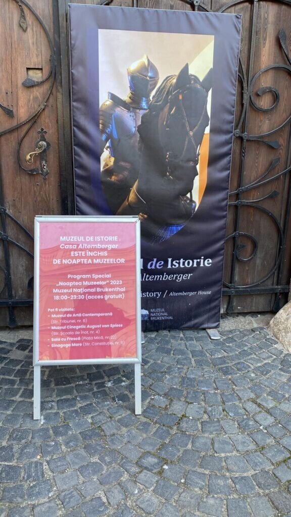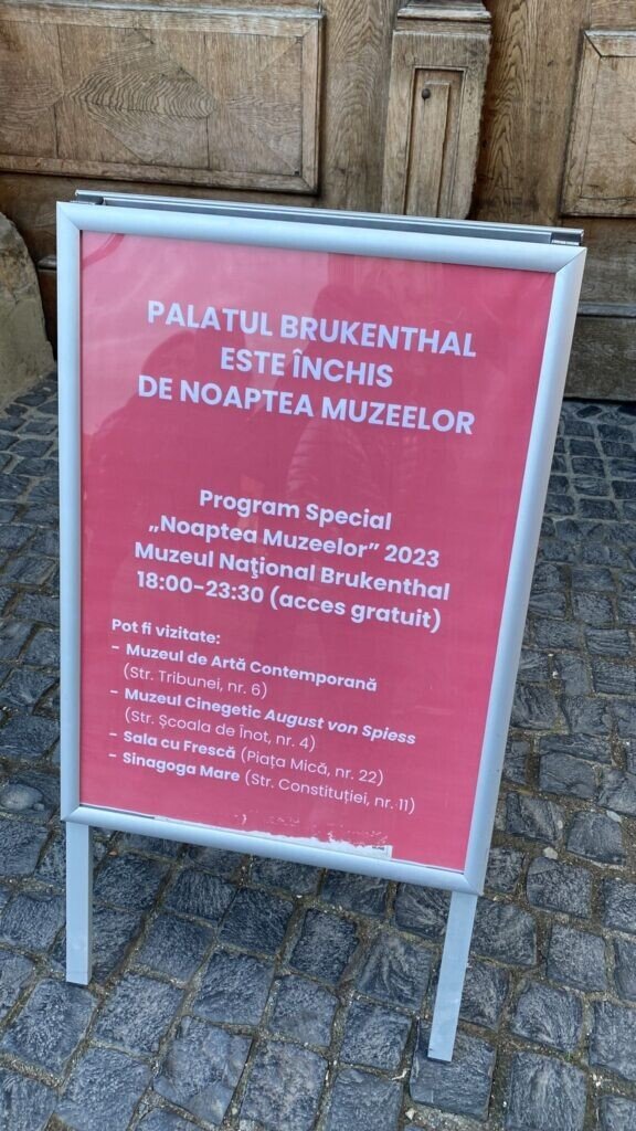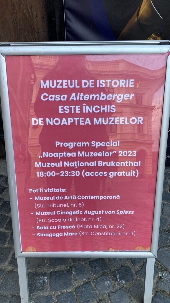 „În cadrul proiectului Noaptea Muzeelor, ce va avea loc în data de 13 mai 2023, între orele 18:00-23.30, Muzeul Național Brukenthal va deschide următoarele sedii: – Muzeul de Artă Contemporană, str. Tribunei, nr. 6, – Muzeul Cinegetic August von Spiess, str. Școala de înot, nr. 4, – Sala cu Frescă, Piața Mică, nr. 22 și Sinagoga Mare. str. Constituției, nr. 11 (în parteneriat cu Comunitatea Evreilor din Sibiu).” anunța conducerea Muzeului Național Brukenthal