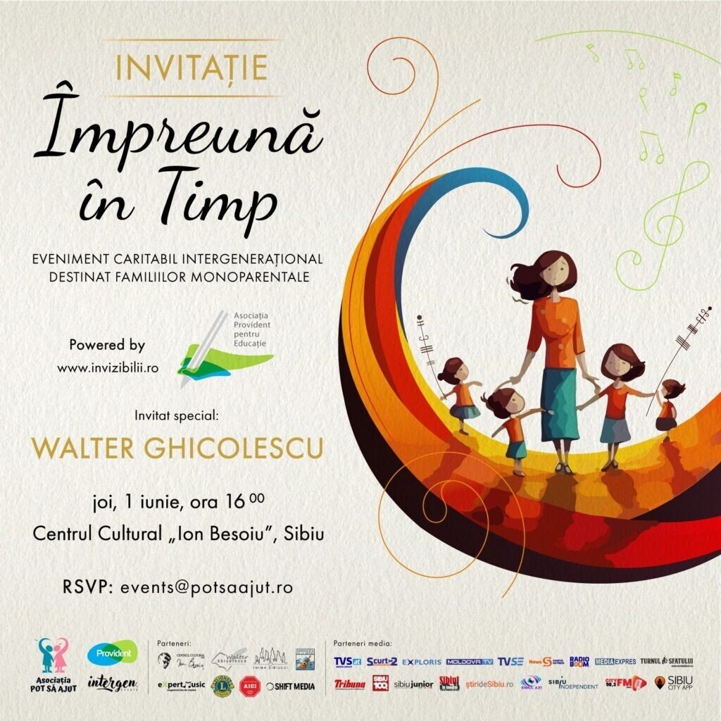 Asociația POT SĂ AJUT, în parteneriat cu Asociația Provident pentru Educație, continuă seria acțiunilor umanitare, de data aceasta vizând în exclusivitate familiile monoparentale din județul Sibiu. Spectacolul intergenerațional „Împreună în timp” este o inițiativă caritabilă destinată atât copiilor, cât și părinților sau bunicilor acestora. Evenimentul va fi o experiență interactivă cu totul aparte pentru public, invitat special fiind artistul Walter Ghicolescu, cadru didactic foarte îndrăgit de sute de copii și, în egală măsură, de adulți, fiind prezent de peste 20 de ani pe scena muzicii folk românești.