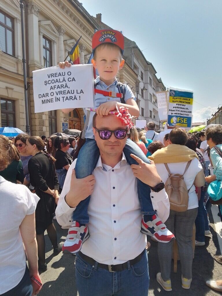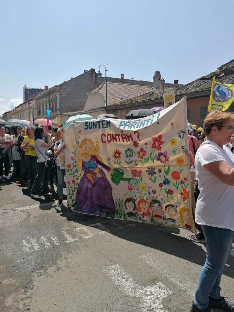 La protestul de la Sibiu, alături de profesori au venit și reprezentanți ai asociațiilor de părinți din unele școli. Unii chiar însoțiți de copii, pentru a susține drepturile profesorilor.