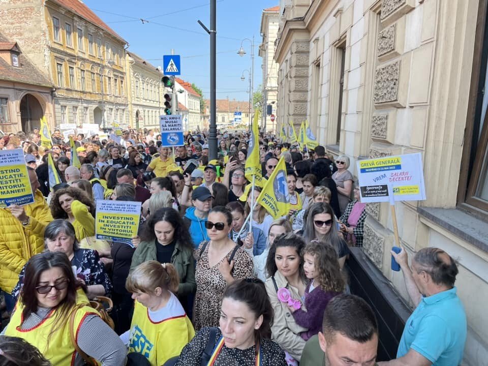 La fel ca în toate marile orașe din țară, profesorii au ieșit în stradă pentru a cere salarii mai mari. Majoritatea protestelor au avut loc ieri. Cei de la Sibiu au ales ziua de vineri pentru a nu deranja vizita oficială a președintelui Germaniei de ieri.