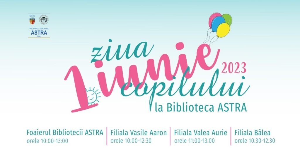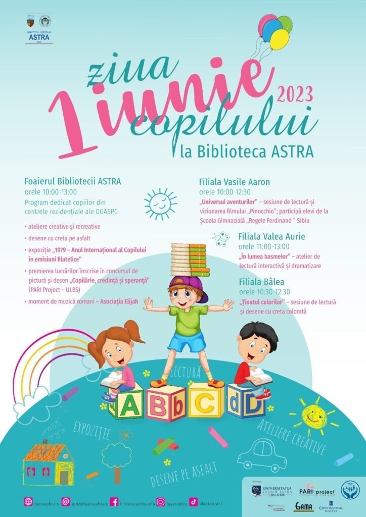 Cu prilejul sărbătoririi Zilei Internaționale a Copilului, Biblioteca Județeană ASTRA Sibiu, instituție care se bucură de susținerea Consiliului Județean Sibiu, organizează joi, 1 iunie 2023, orele 10:00-13:00, o serie de activități recreative și educative dedicate celor mici. Astfel, la sediul central al bibliotecii, programul va fi dedicat copiilor care beneficiază de serviciile sociale acordate de centrele rezidențiale ale DGASPC. Aceștia se vor bucura de momente de relaxare și distracție în foaierul bibliotecii (Str. George Barițiu, nr.7, Corp B), în cadrul unor acțiuni organizate de Compartimentul pentru Copii și Tineret: ateliere creative și recreative, desene cu creta pe asfalt, vizionarea expoziției de timbre „1979 – Anul Internațional al Copilului în emisiuni filatelice”. În egală măsură, copiii vor avea ocazia să admire lucrările Concursului de pictură și desen „Copilărie, credință și speranță” și să asiste la un moment de muzică romani, aceste acțiuni fiind organizate în parteneriat cu PARI Project – ULBS.