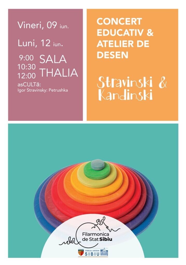 Vineri, 9 iunie, și vineri, 12 iunie, de la orele 9.00, seria evenimentelor educative continuă cu un proiect în care copiii vor avea ocazia nu doar să se bucure de tempourile muzicii de pian, dar și să exploreze emoțiile transmise de aceasta prin culoare: „Cercurile concentrice ale lui Kandinski, acompaniate de muzica lui Stravinski”. Concertul-lecție pornește de la îndrăgita compoziție „Petrușka” de Igor Stravinsky și se adresează celor cu vârste între 9 și 12 ani.