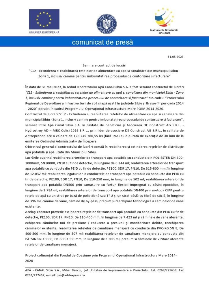 A fost semnat contractul de lucrări “Extinderea si reabilitarea rețelelor de alimentare cu apă și canalizare din municipiul Sibiu ”