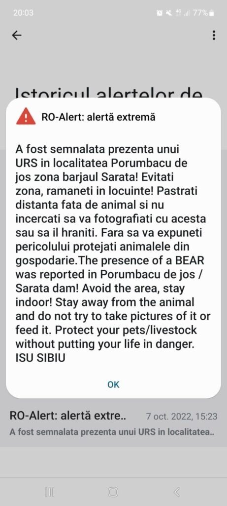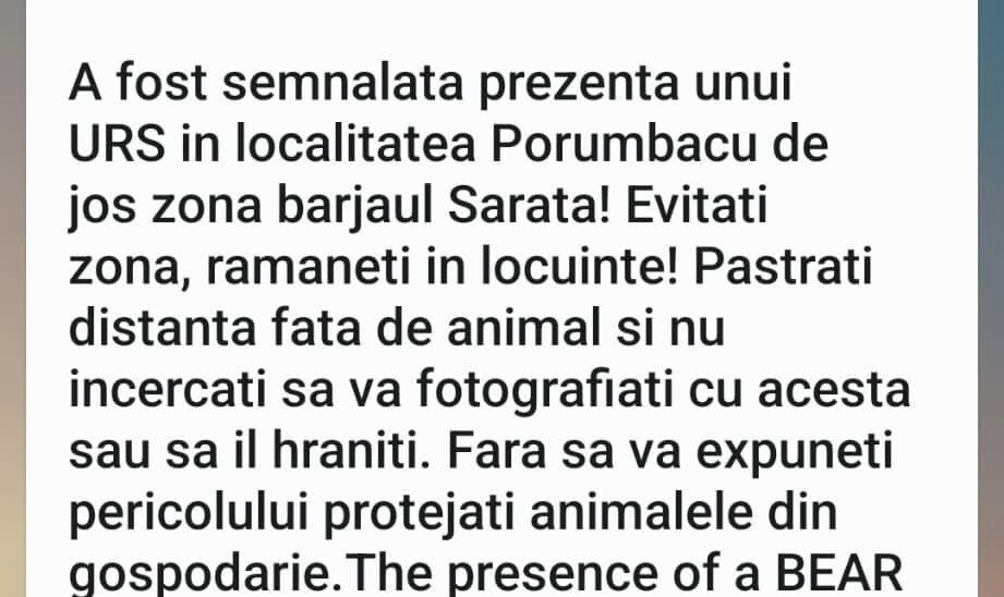 ISU Sibiu a emis un mesaj de avertizare RO-Alert, în localitatea Porumbacul de Jos, întrucât a fost semnalată prezența unui urs.