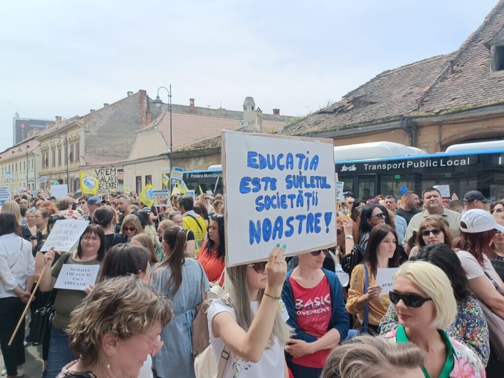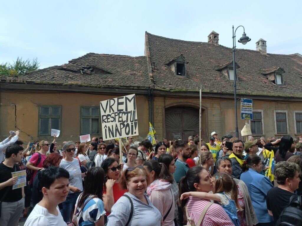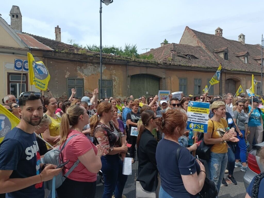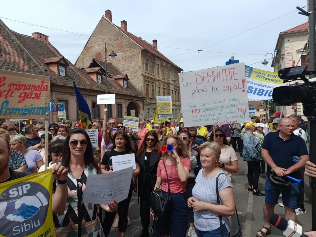 Aproape 2000 de profesori din județ, alături și de unii elevi, au venit în Piața Mare. S-a scandat mult „demnitate”. Profesorii au pornit în marș spre Prefectura Sibiu. În dreptul Colegiului Gheorghe Lazăr, coloana a scandat „Ieși afară, Carmen!”. Mesajul era adresa profesoarei Carmen Iohannis, soția președintelui României care a declarat că nu dorește să facă grevă.