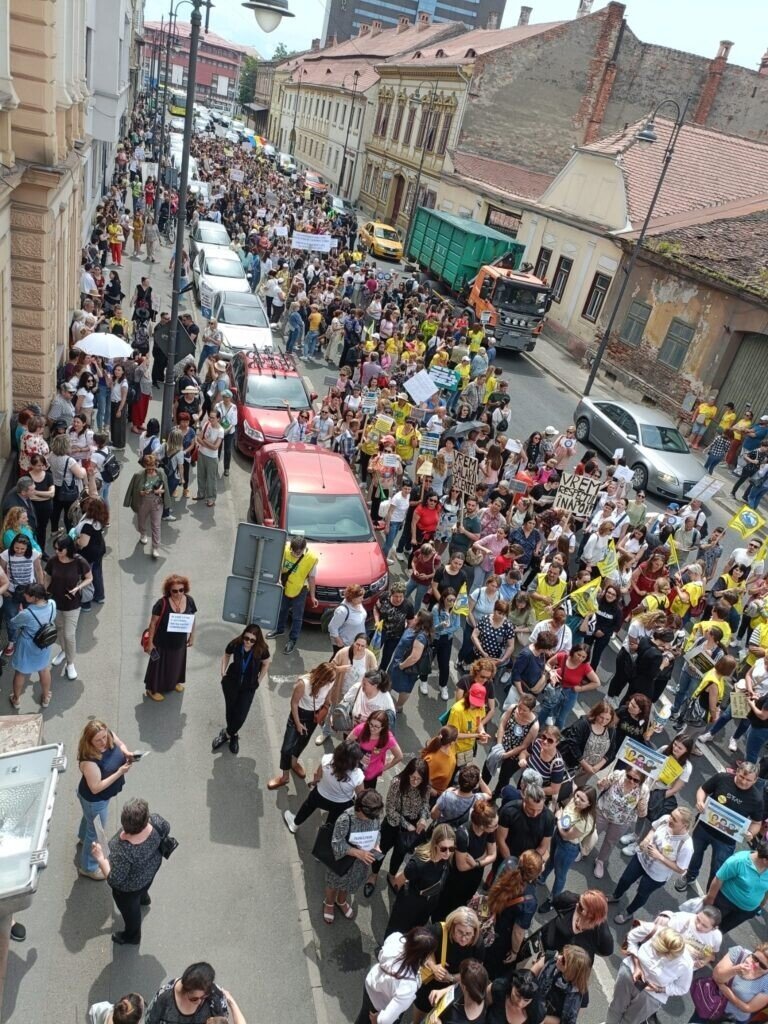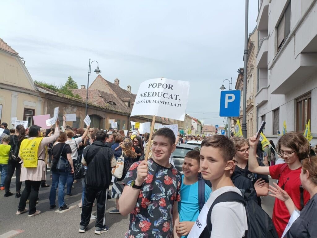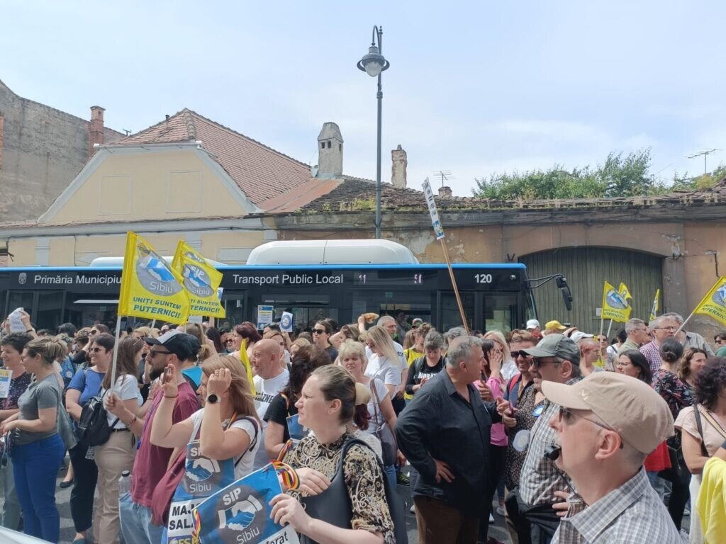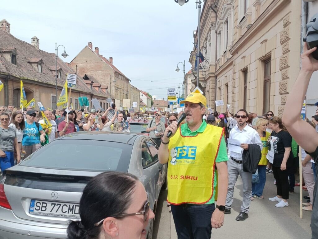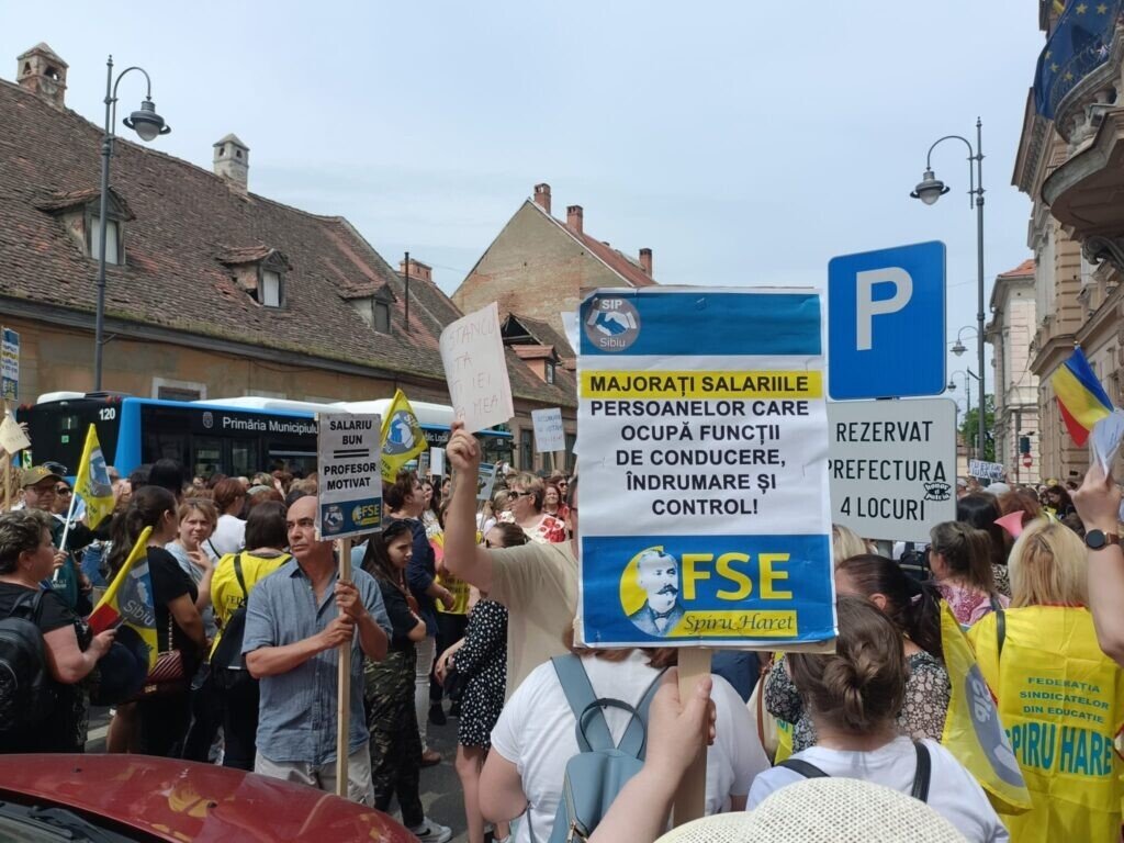 Aproape 2000 de profesori din județ, alături și de unii elevi, au venit în Piața Mare. S-a scandat mult „demnitate”. Profesorii au pornit în marș spre Prefectura Sibiu. În dreptul Colegiului Gheorghe Lazăr, coloana a scandat „Ieși afară, Carmen!”. Mesajul era adresa profesoarei Carmen Iohannis, soția președintelui României care a declarat că nu dorește să facă grevă.