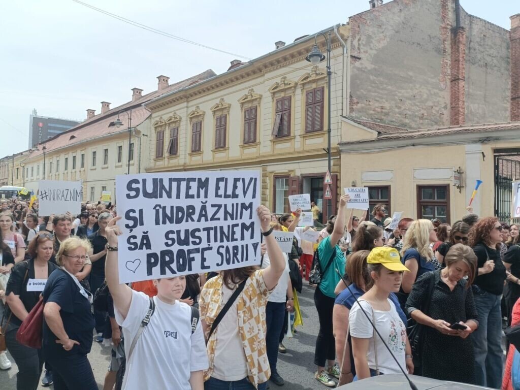 După reacția dură a președintelui Iohannis de zilele trecute împotriva profesorilor greviști, astăzi la mitingul început în Piața Mare din Sibiu mulți au purtat pe piept cuvântul „îndrăznesc”. Unii au venit chiar cu un banner pe care scria „O lume minunată în care veți găsi… numai promisiuni” referitor la momentul tipic comunistic din timpul vizitei președintelui Germaniei alături de Iohannis la Sibiu.