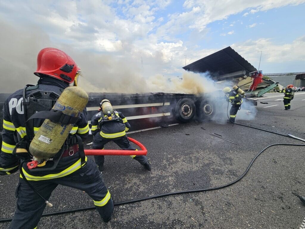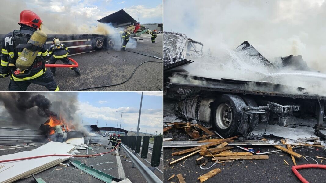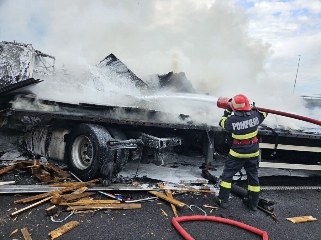 Autostrada A10, pe sensul Sebeș – Cluj, este blocată la această oră din cauza unui accident rutier. Un autocamion a luat foc.