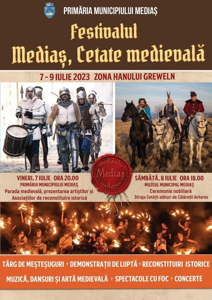 Primăria Municipiului Mediaș va organiza în perioada 7 – 9 iulie 2023 o nouă ediție a tradiționalului festival ,,Mediaș, Cetate Medievală”, ajuns anul acesta la cea de-a XIX- a ediție. Pe perioada celor trei zile de desfășurare a evenimentului, din programul pregătit de către organizatori nu vor lipsi scenete de teatru, concerte de muzică medievală și renascentistă, expoziții, ateliere de gastronomie, demonstrații ale ordinelor cavalerești, animație stradală și multe alte surprize.