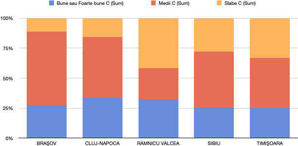 Procentul de școli bune și foarte bune este asemănător în orașele analizate.