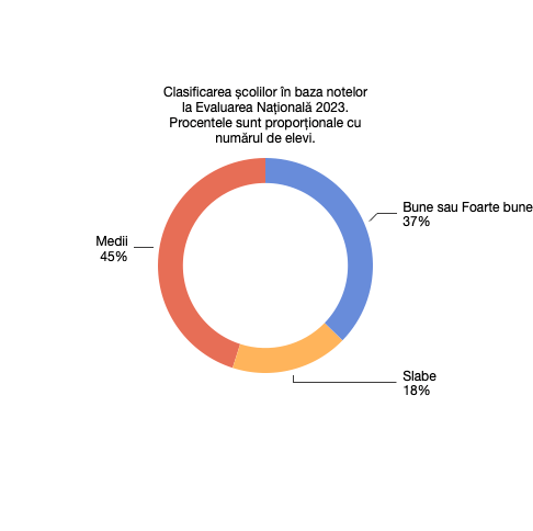 - 46% dintre școli cu rezultate medii, în care mediana notelor este situată între 7- 8,5. În aceste școli, 744 de elevi au dat examenul de Evaluare Națională.