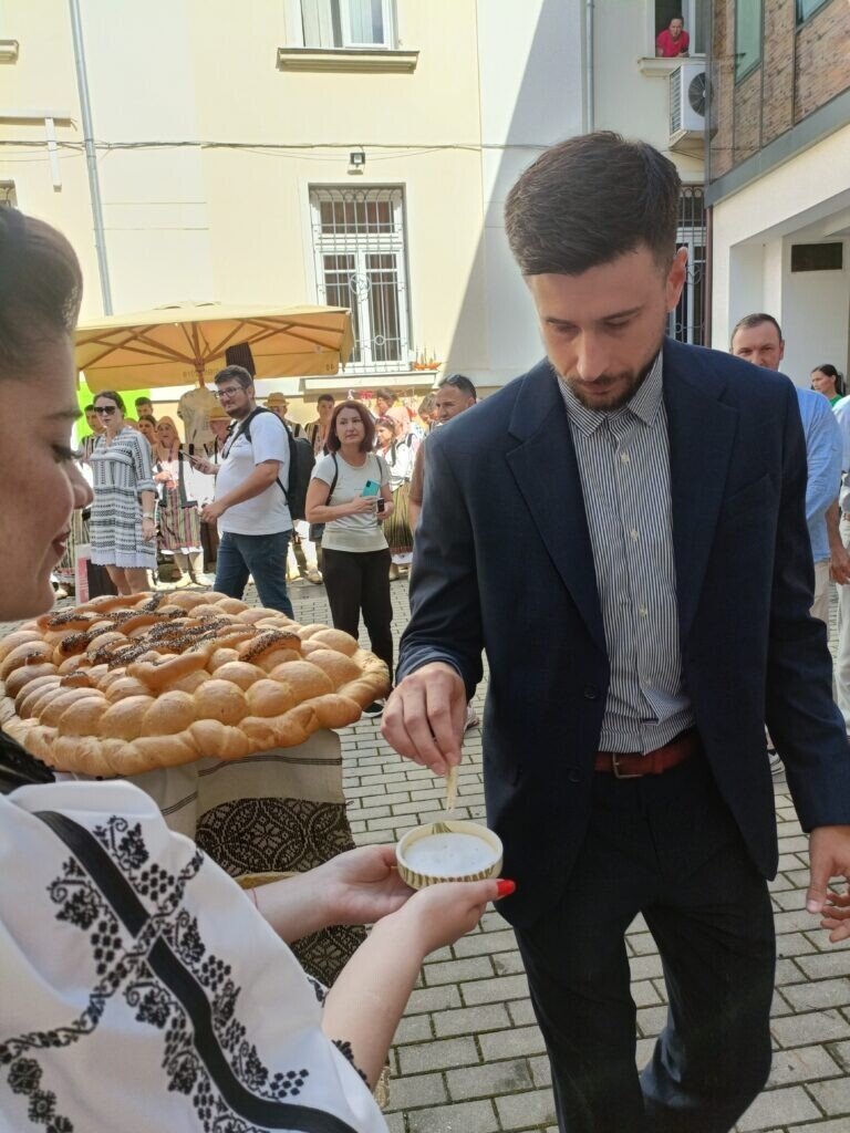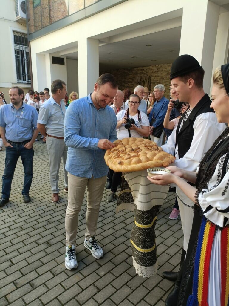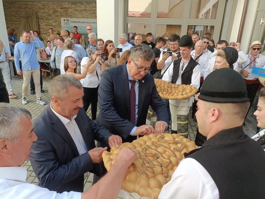 După spectacolul oferit în curtea Consiliului Județean oficialii au fost primiți cu pâine și sare de reprezentanți ai ansamblului Junii Sibiului.