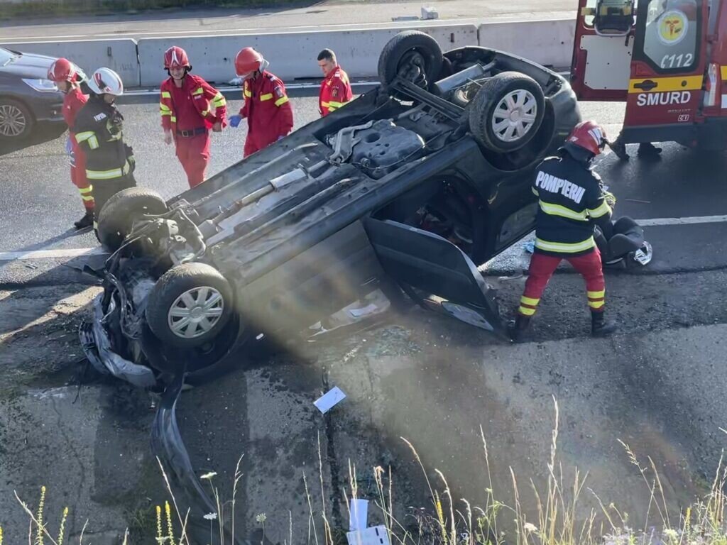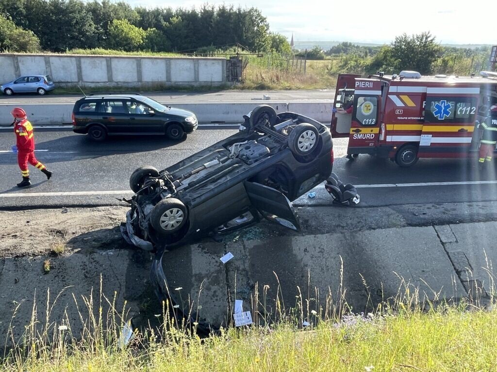 Un șofer în vârstă de aproximativ 35 de ani a ajuns la spital după ce s-a răsturnat cu mașina pe DN1, sens Sibiu – Veștem, în vecinătatea localității Șelimbăr.