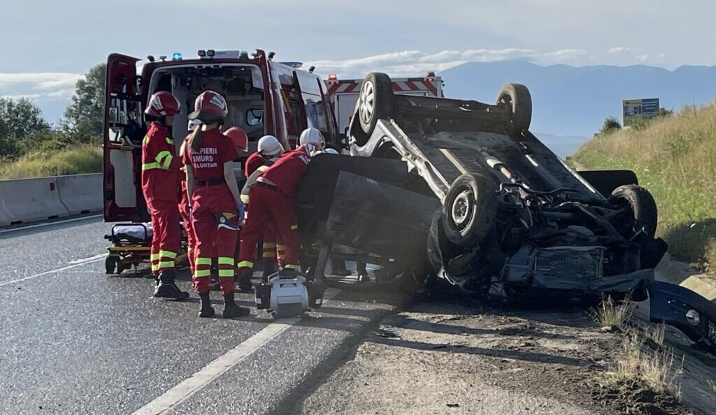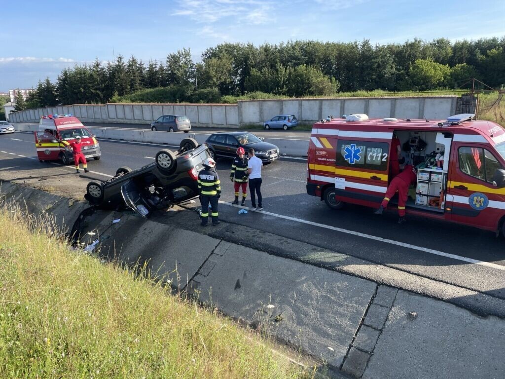 Conform primelor date, șoferul nu ar fi adaptat viteza la condițiile de drum, a derapat și s-a răsturnat în afara părții carosabile. La fața locului sunt deja mai multe echipaje de prim-ajutor și Poliție.