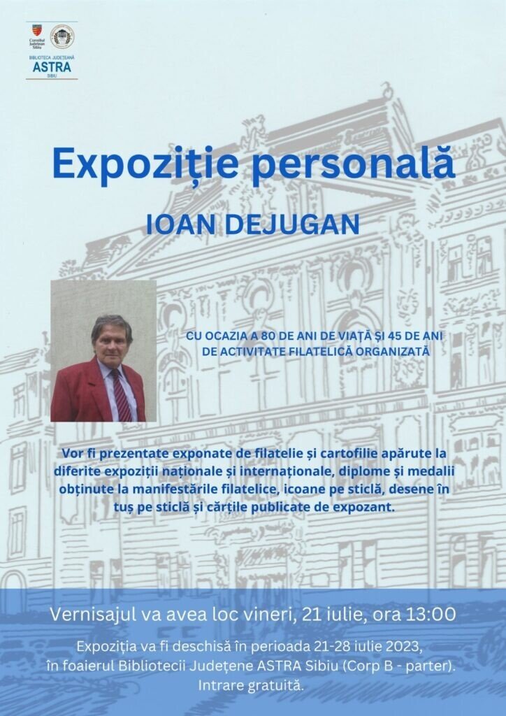 Colecția personală de exponate de filatelie și cartofilie a ing. Ioan Dejugan, vicepreşedintele Asociaţiei Filateliştilor din judeţul Sibiu, va fi subiectul unei expoziții care va avea vernisajul vineri, 21 iulie 2023, la Biblioteca Județeană ASTRA Sibiu, instituție care se bucură de susținerea financiară a Consiliului Județean Sibiu.