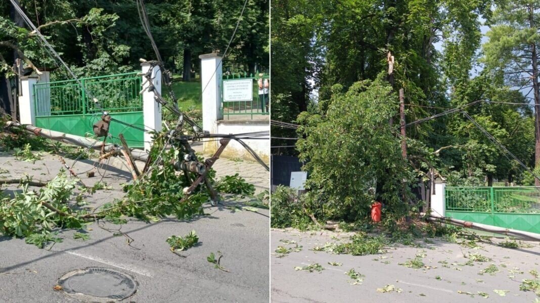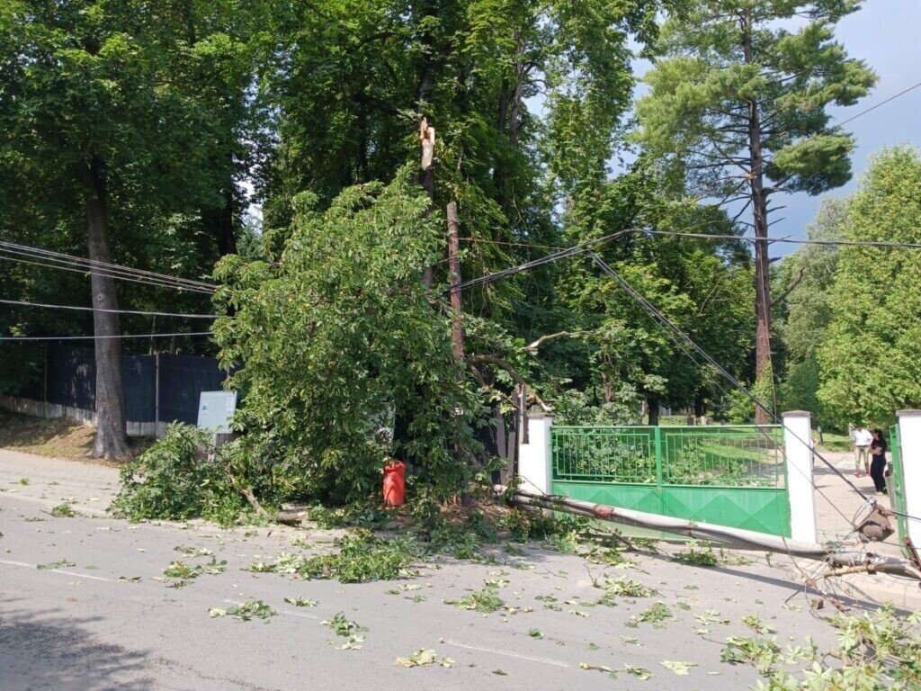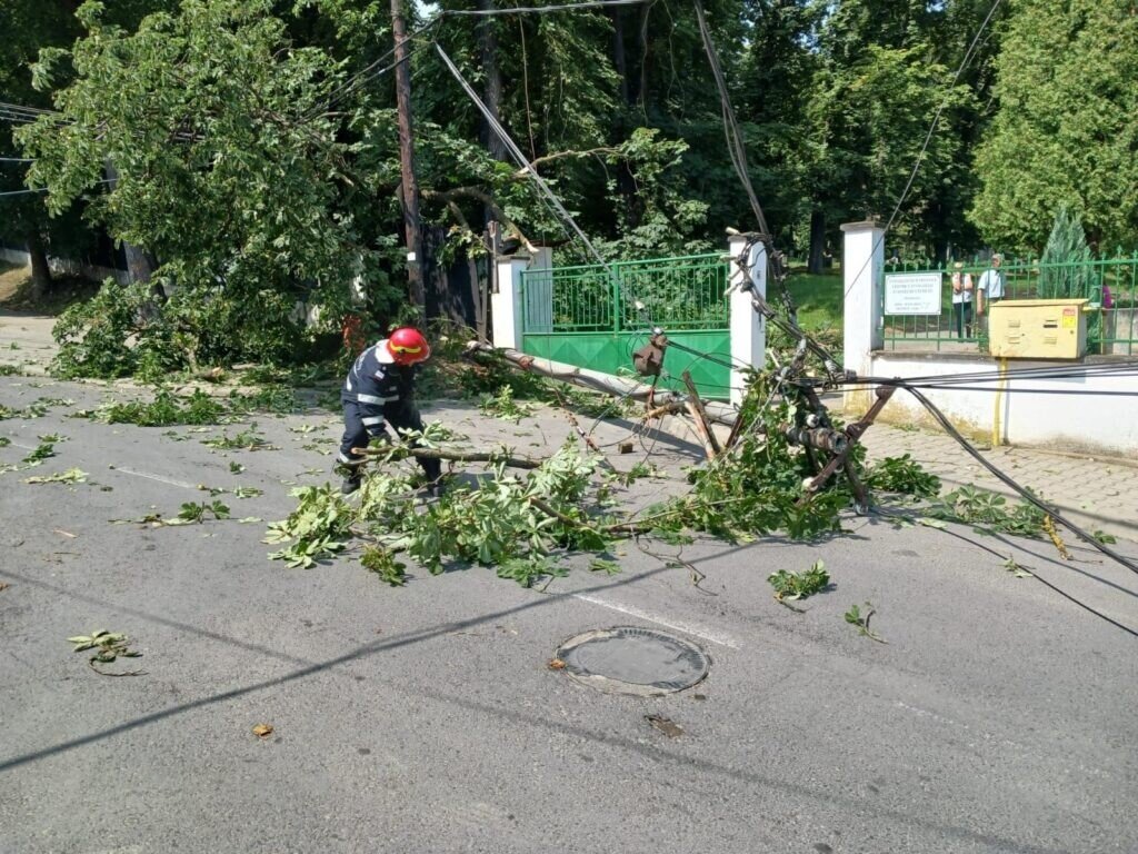 Acolo, un stâlp de electricitate a fost rupt și mai multe crengi de copac au căzut peste cablurile electrice. La fața locului intervine și un echipaj electrica întrucât cablurile se află sub tensiune.