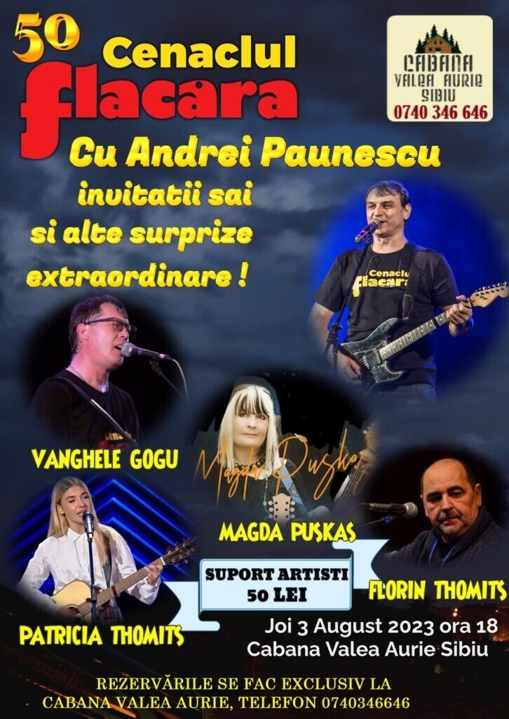 Turneul „Cenaclul Flacăra 50” ajunge la Sibiu în 3 august 2023, ora 18, la Cabana Valea Aurie, într-o formulă inedită: Andrei Păunescu, Magda Puskas, Vanghele Gogu, Florin Thomits, Patricia Thomits.