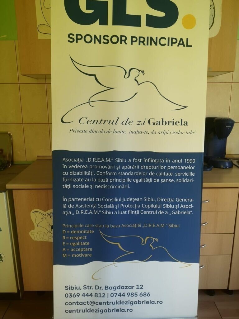 GLS România, sponsorul nostru principal, căruia îi datorăm cele mai importante îmbunătățiri ale mediului ambiant și condițiilor din centru, ne este alături de câțiva ani. Acest lucru ne ajută să acordăm beneficiarilor noștri servicii care îndeplinesc standardele de calitate, în conformitate cu legislața în vigoare. Avem considerație, recunoștință și respect pentru această companie care sprijină financiar Asociația D.R.E.A.M. Sibiu și Centrul de zi „Gabriela” pentru a putea acorda în continuare servicii persoanelor cu dizabilități și celor defavorizați. Aceste persoane au nevoie de sprijinul dumneavoastră pentru egalitatea de șanse, pentru reintegrarea socială, pentru recuperare și reabilitare, pentru respectarea drepturilor persoanelor cu dizabilități, pentru prevenirea discriminării.” ne-a declarat președintele Asociației D.R.E.A.M., Neagu Lucia.