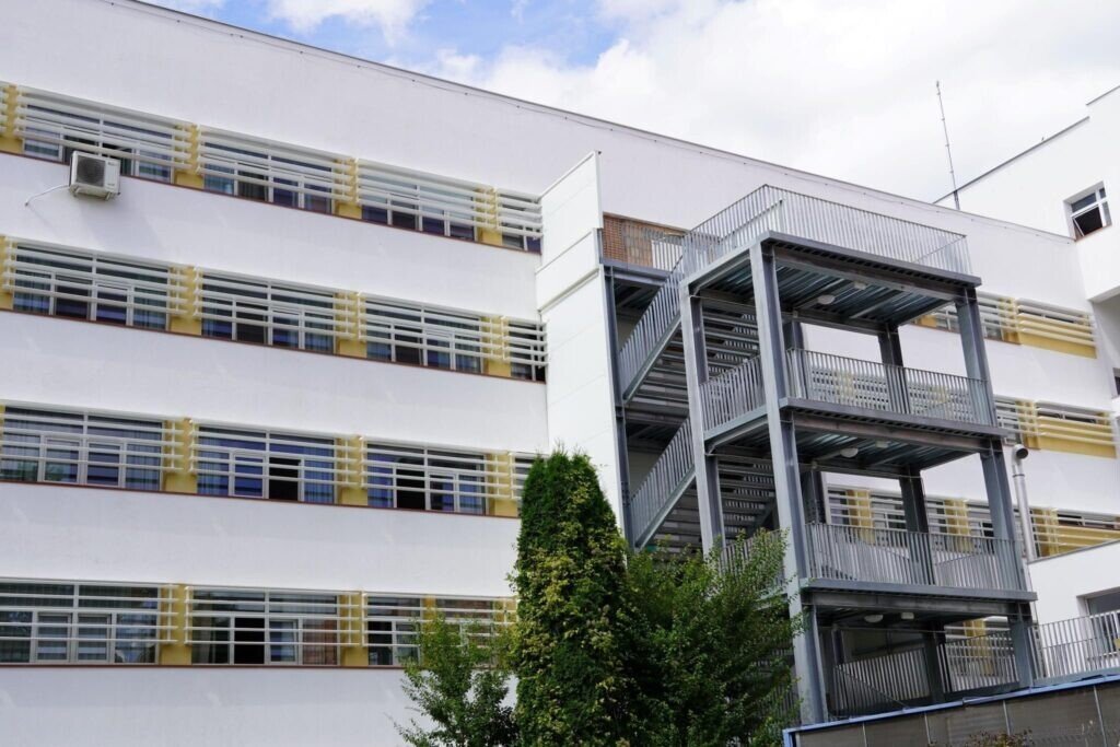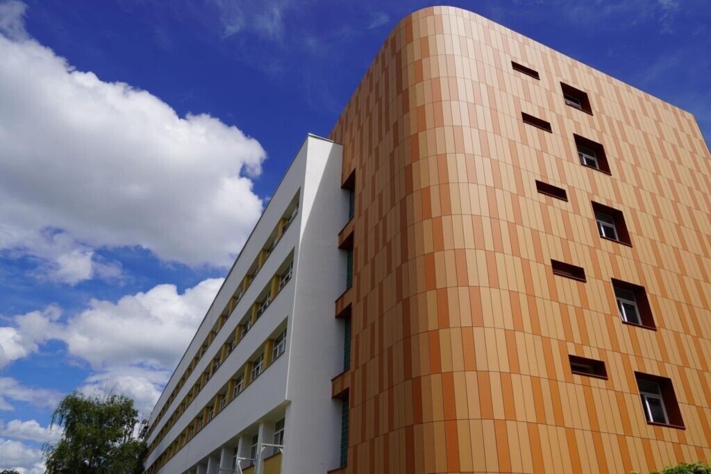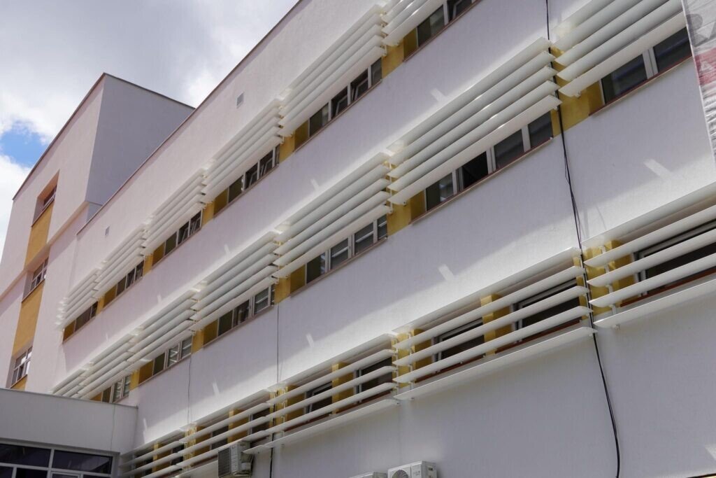 Se remarcă fațada ventilată de pe capetele clădirii, acoperită cu plăci ceramice, dar și sistemul parasolar montat la geamurile dinspre curtea spitalului.