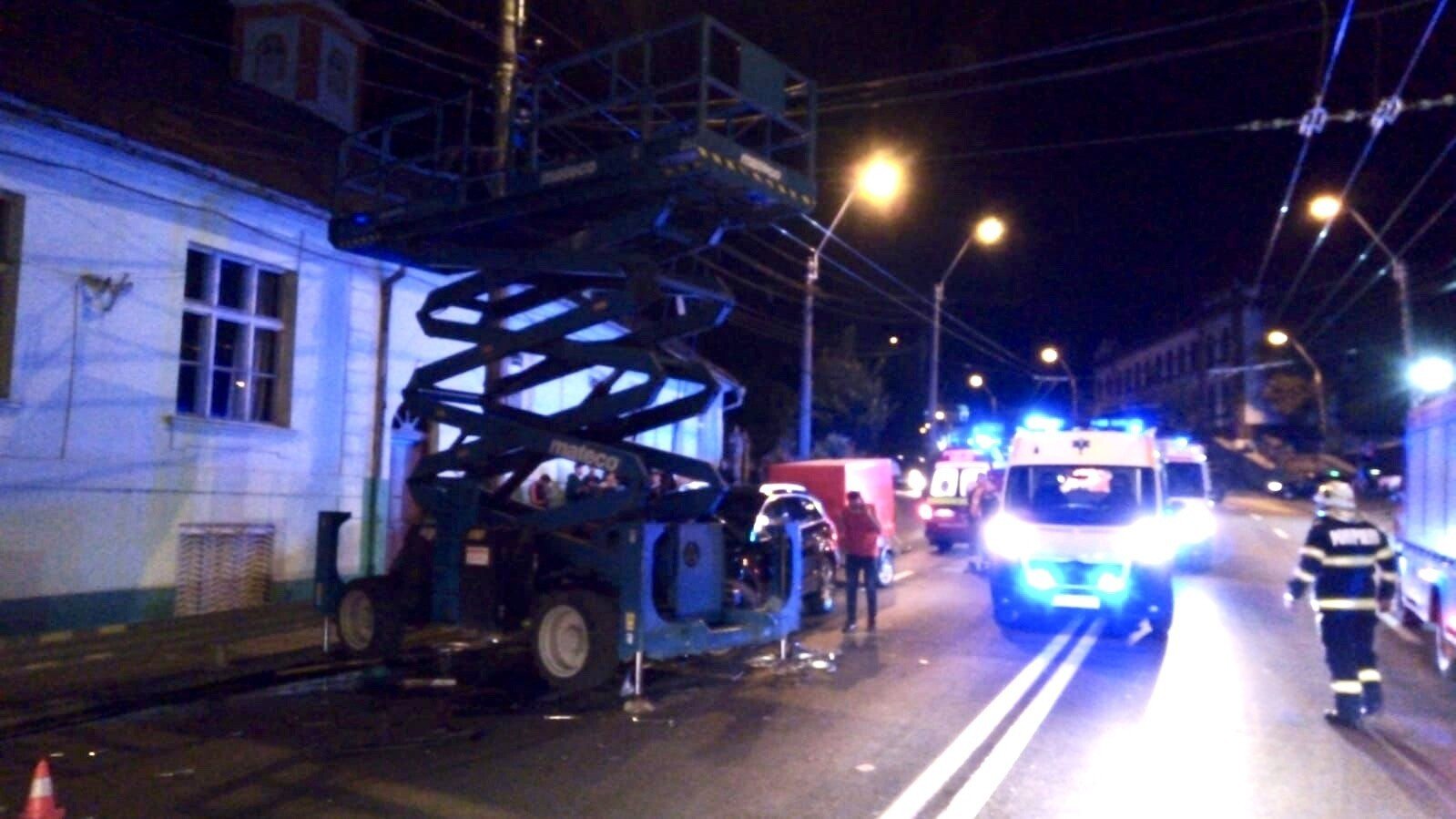 Patru muncitori ce efectuau lucrări la înălțime, azi-noapte, pe strada Unirii din municipiul Mediaș au fost răniți de către șoferul unei mașini. Acesta le-a izbit utilajul în care se aflau.