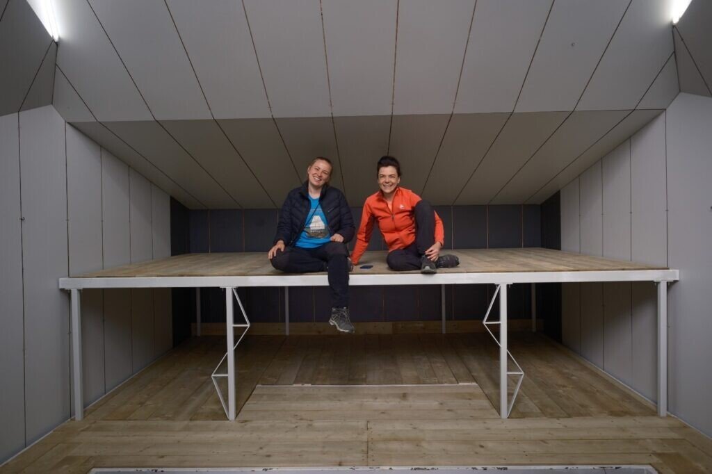 - Scara se întinde pe 36 mp, împărțiți îndouă zone funcționale – un vestibul și un spațiu comun cu loc de luat masa și dormit. Refugiul poate adăposti confortabil 15-18 persoane, dar poate depăși această capacitate când situația o va cere.