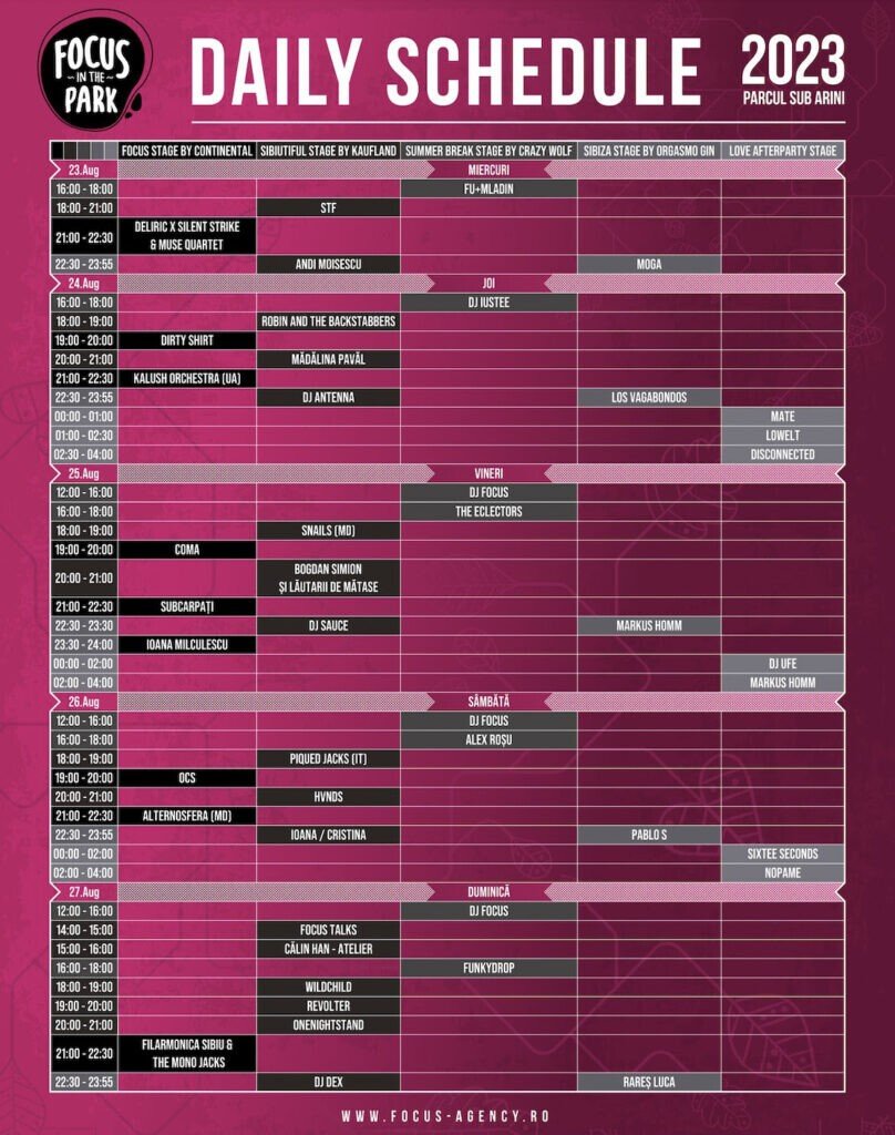 Vineri e ziua în care concertează Subcarpați, una dintre trupele cu cele mai numeroase prezențe la Focus in the Park. Alături de Subcarpați, vineri vor mai concerta Coma, Snails, Bogdan Simion și Lăutarii de Mătase plus mulți alți DJ și artiști.