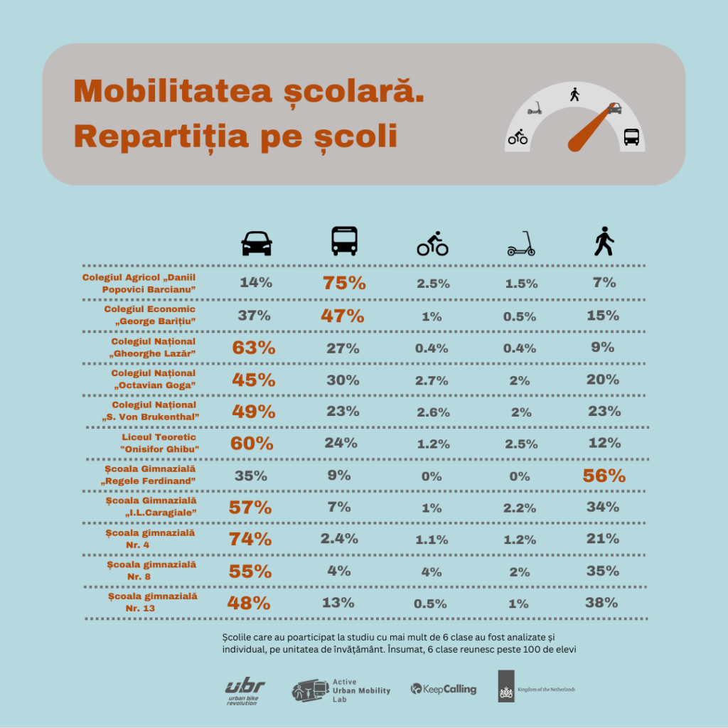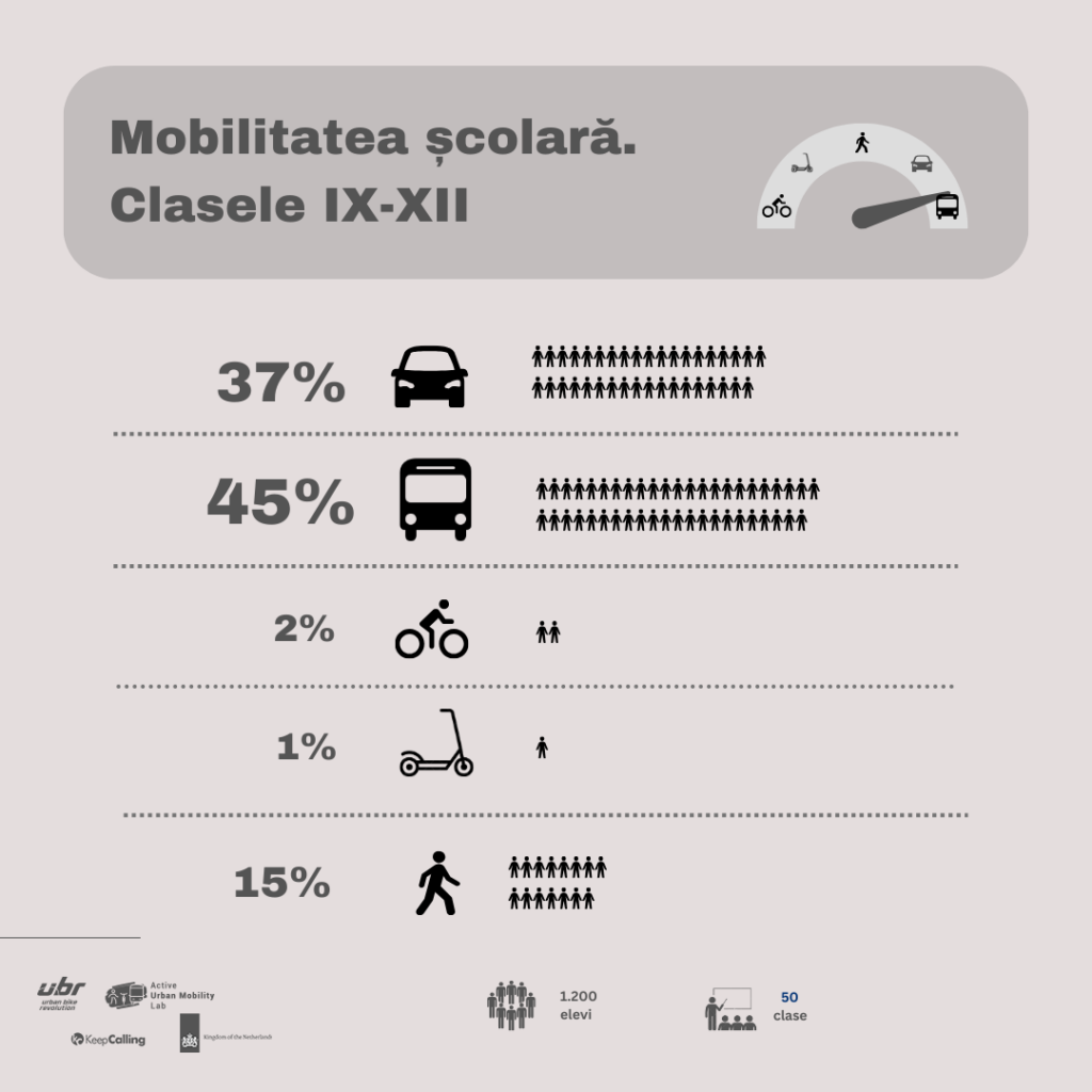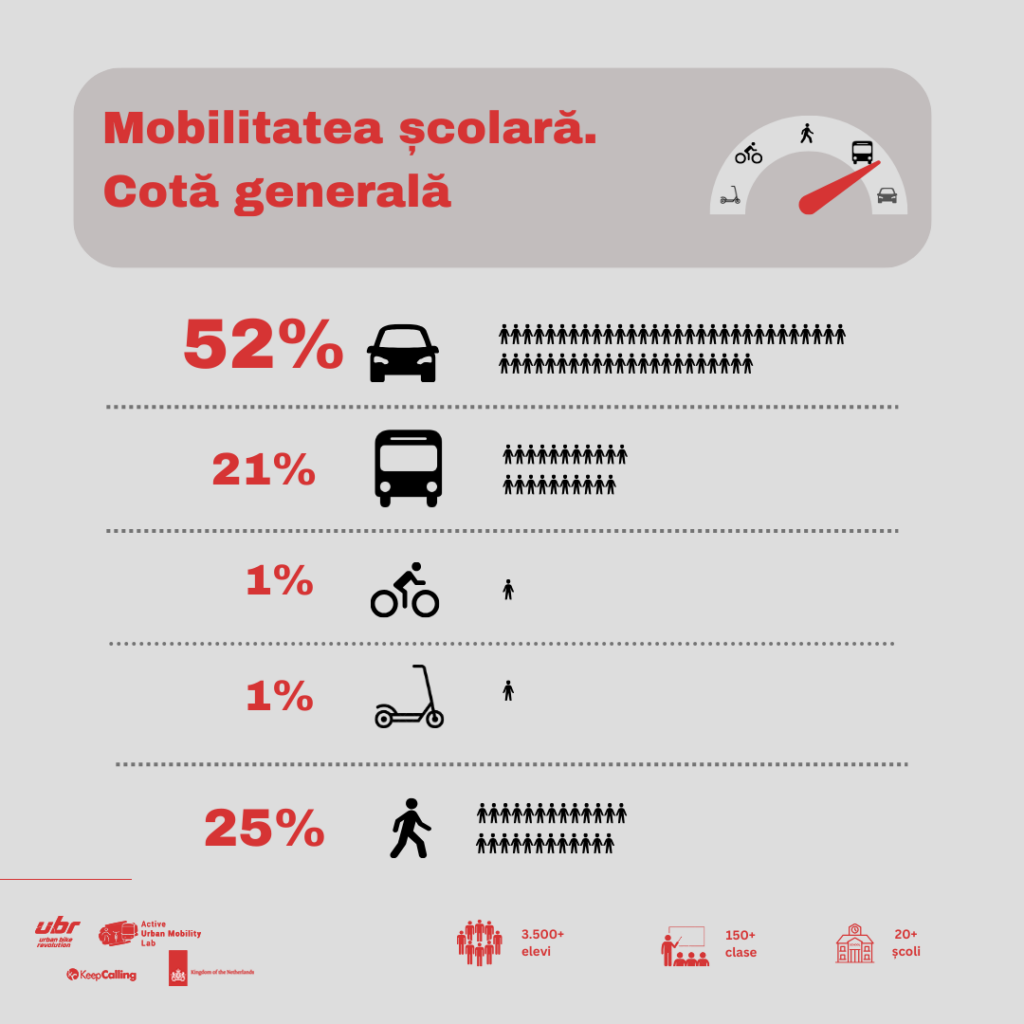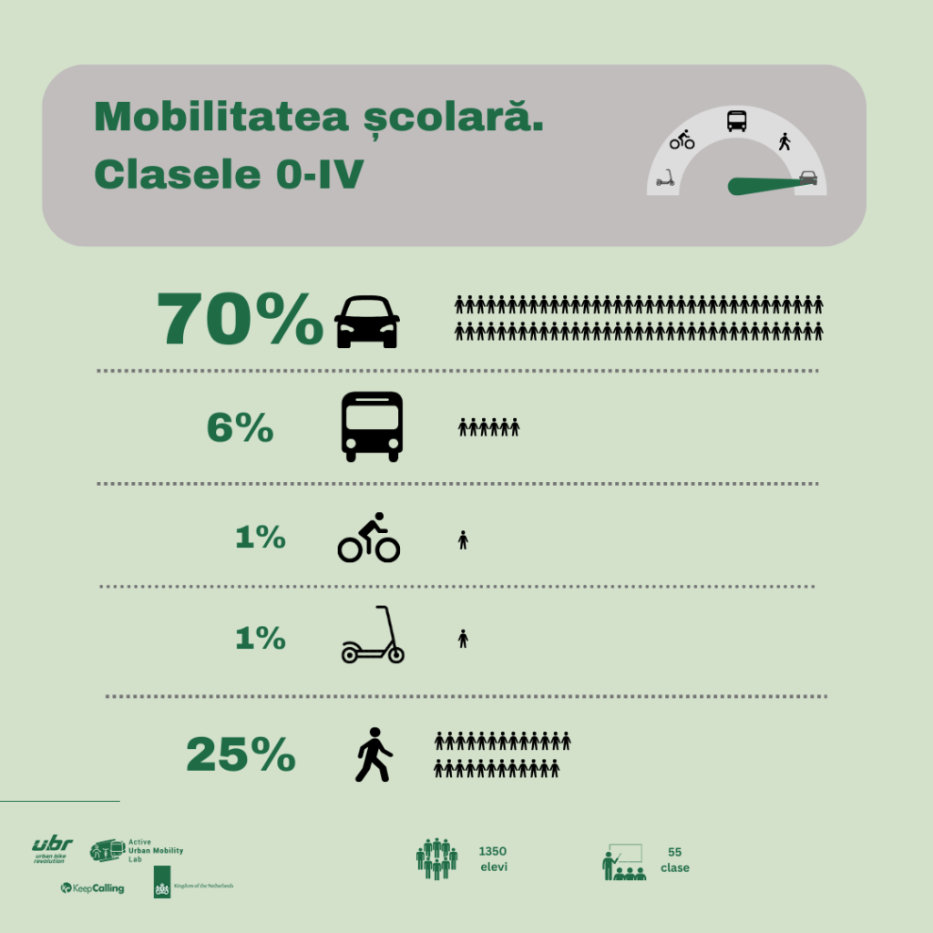 Rezultatele cumulate arată o realitate îngrijorătoare. Peste 50% din elevi sunt transportați la școală cu mașina, iar la nivelul ciclului primar acest procent ajunge la 70%. Chiar și în rândul elevilor de liceu, aproape 40% folosesc mașina pentru a ajunge la școală. Acest lucru este îngrijorător, în special având în vedere că mulți dintre acești elevi ar avea discernământul necesar să se deplaseze pe cont propriu.