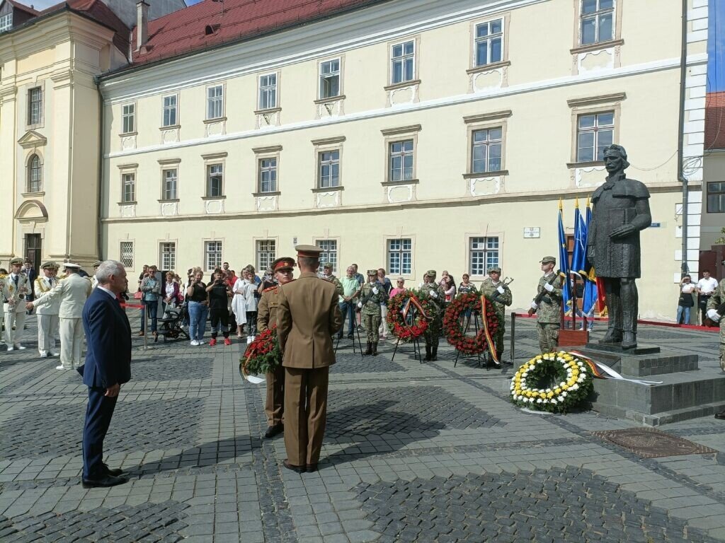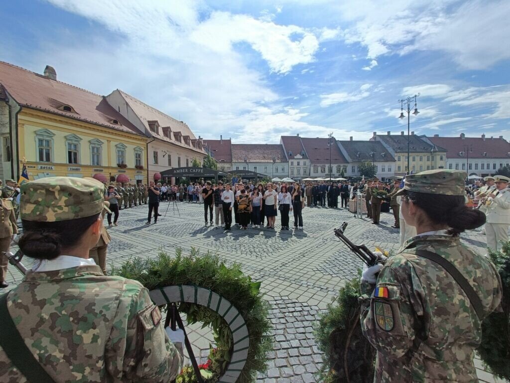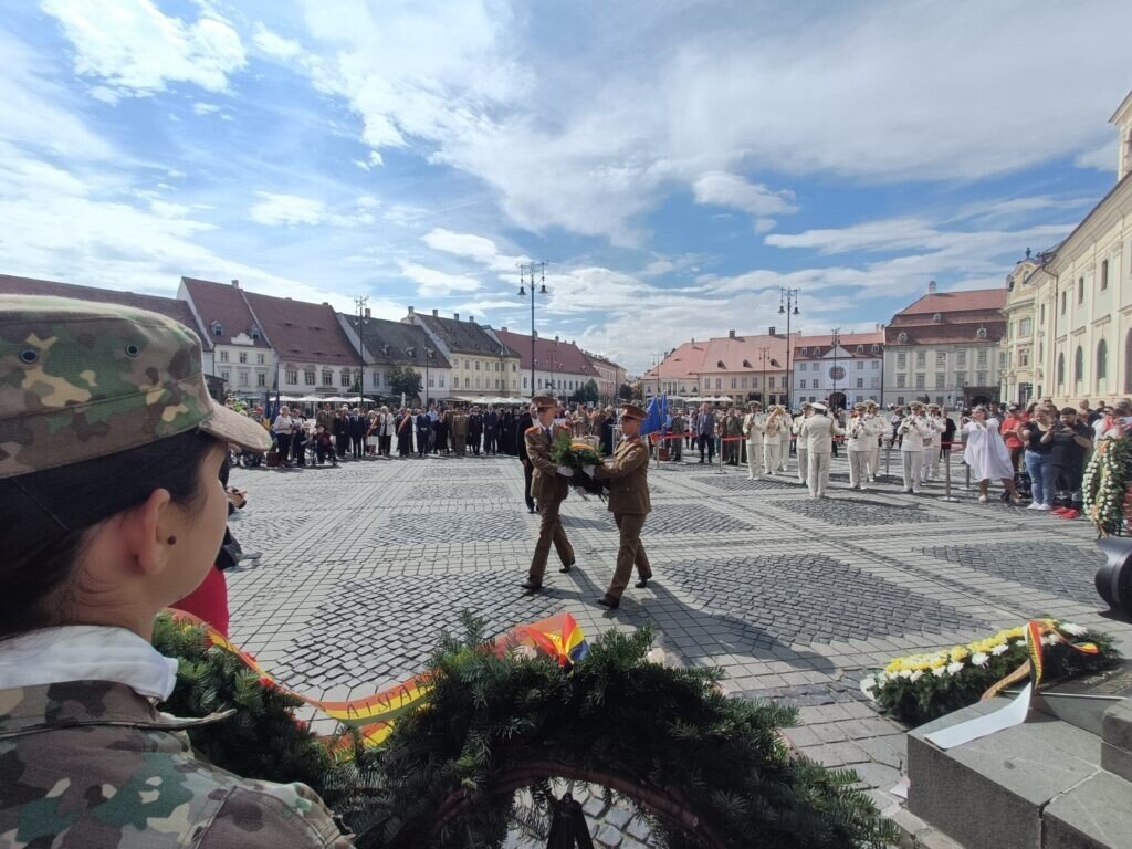 Ceremonialul a continuat cu depuneri de coroane pe muzica Fanfarei Militare Sibiu. Garda Garnizoanei a dat onorul.