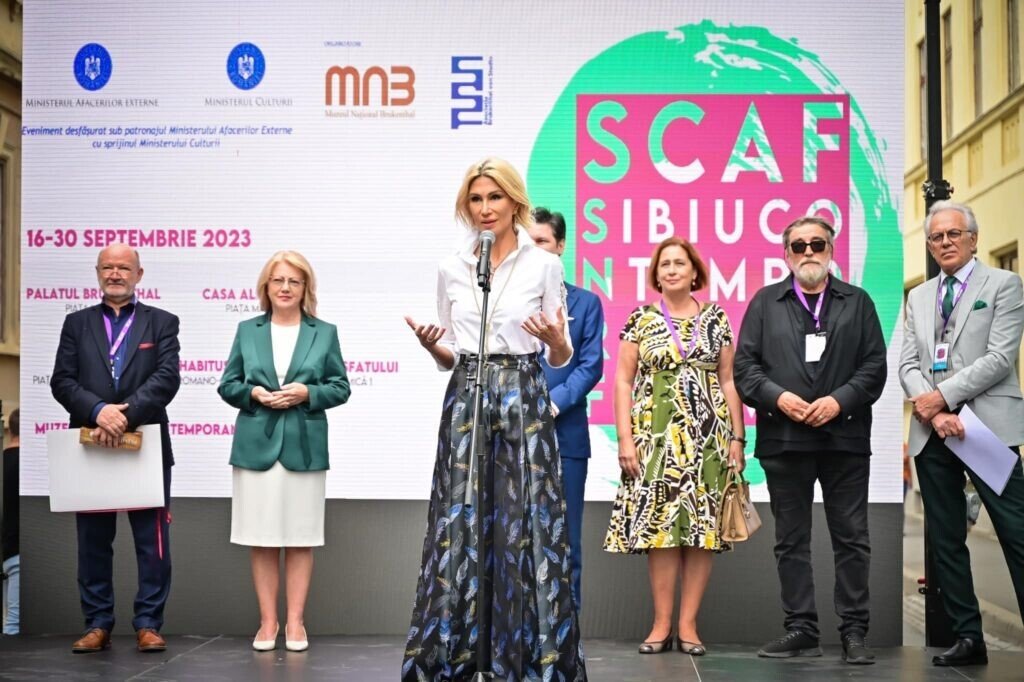 Strada Tribunei din Sibiu a fost astăzi închisă ore bune. O scenă uriașă amplasată în dreptul Muzeului de Artă Contemporană (fostul cinema ARTA). Aici a avut loc deschiderea oficială a SCAF 2023. Raluca Turcan, ministrul Culturii a încurajat apariția acestui festival la Sibiu și a susținut ideea lui Alexandru Chituță de a crea la Sibiu un centru al artei contemporane mondiale.