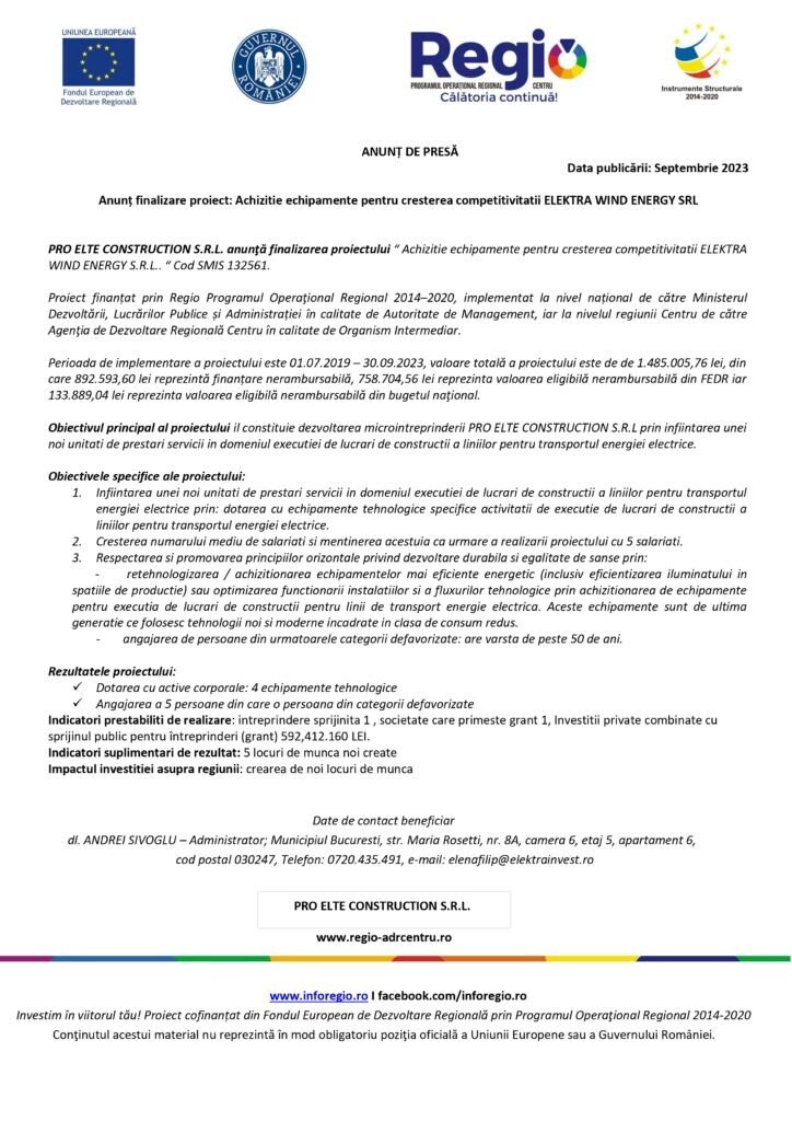 Anunț finalizare proiect: Achizitie echipamente pentru cresterea competitivitatii ELEKTRA WIND ENERGY SRL