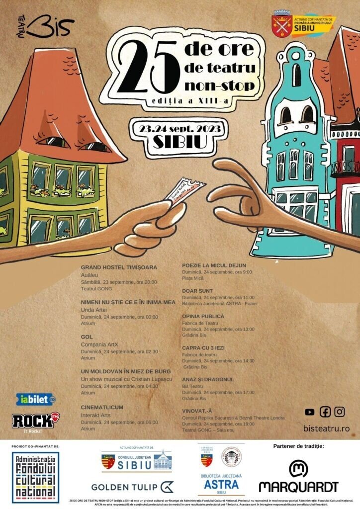 - 25 DE ORE DE TEATRU NON-STOP (ediția a XIII-a) este un proiect cultural co-finanţat de Administraţia Fondului Cultural Naţional. Proiectul nu reprezintă în mod necesar poziţia Administrației Fondului Cultural Național. AFCN nu este responsabilă de conținutul proiectului sau de modul în care rezultatele proiectului pot fi folosite. Acestea sunt în întregime responsabilitatea beneficiarului finanțării.