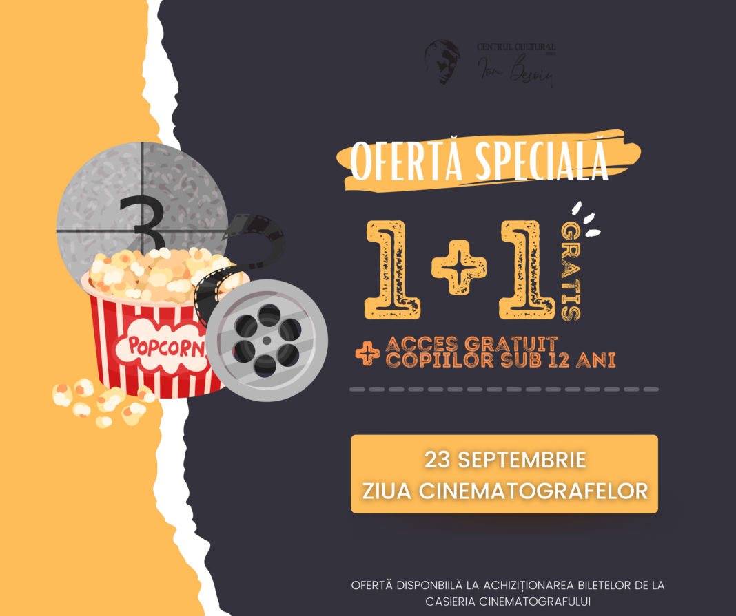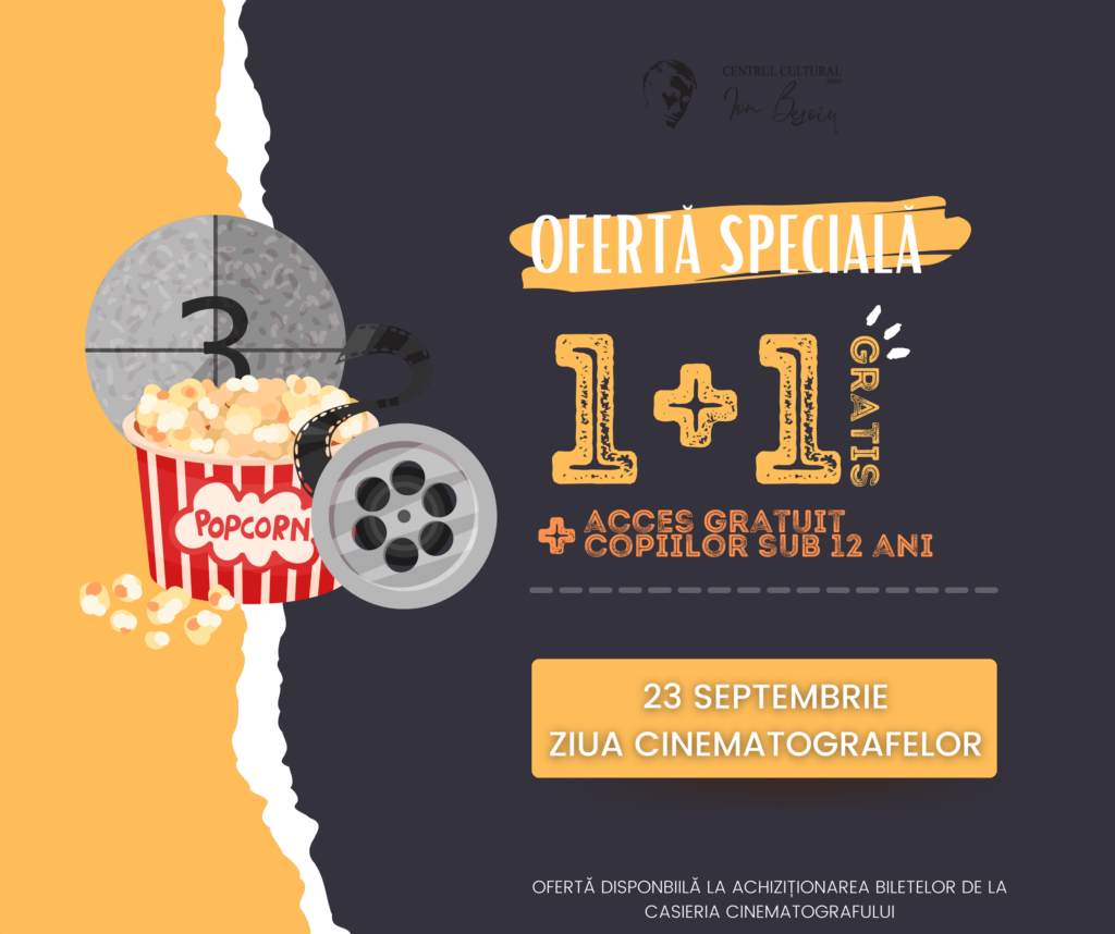 Sâmbătă, 23 septembrie, Cinema „Ion Besoiu”, sibienii sunt invitați să petreacă Ziua Cinematografelor profitând de faptul că, pentru o zi, cel mai ieftin cinematograf din Sibiu devine și mai ieftin! Pentru fiecare bilet plătit, se oferă încă unul gratuit, iar copiii sub 12 ani au parte tot de acces gratuit! Oferta specială este disponibilă la achiziționarea biletelor de la casieria cinematografului, exclusiv pe 23 septembrie, de Ziua Cinematografelor. Prețul unui bilet pentru orice proiecție rămâne 10 lei, astfel că o întreagă familie se poate bucura de experiența vizionării în cea mai mare „sufragerie” din Sibiu pentru doar 10 lei! Programul proiecțiilor se găsește pe eventbook.ro și în Sibiu City App.