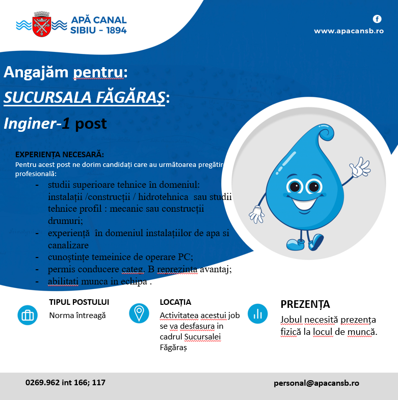APĂ CANAL SIBIU S.A. angajează pentru Sucursala Făgăraș INGINER în domeniul : instalații în construcții / hidrotehnica -1 post