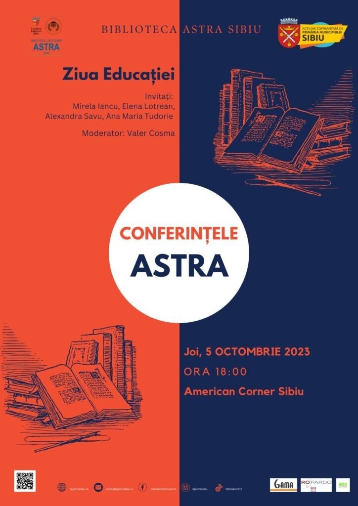 Ziua Educației va fi marcată pe 5 octombrie, la Biblioteca ASTRA, printr-o nouă întâlnire, în cadrul proiectului „Conferințele ASTRA”, cofinanțat de Primăria Municipiului Sibiu și susținut de Consiliul Județean Sibiu.