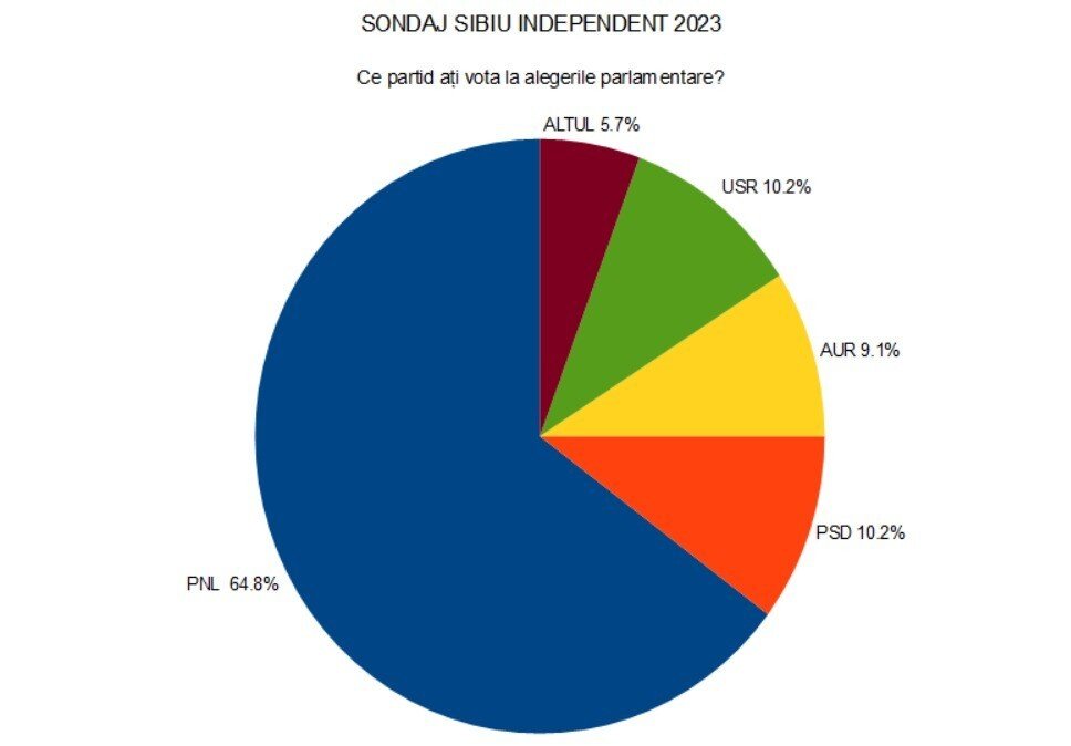 Intenția de vot a sibienilor pentru alegerile parlamentare de anul viitor arată un PNL la aproape 65%, urmat de PSD și USR cap la cap cu 10% și AUR imediat lângă ei cu 9%. Alte partide au obținut aproape 6%.