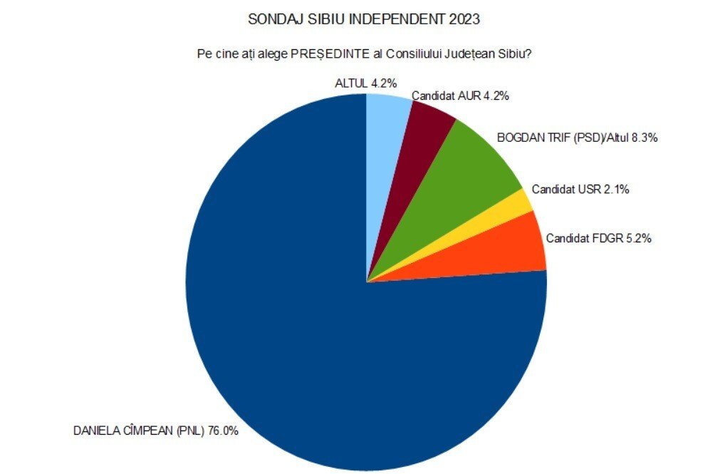 În cazul intenției de vot din municipiul Sibiu pentru președintele Consiliului Județean Sibiu a trebuit să numărăm de două ori. Rezultatul uriaș obținut în toate cartierele de Daniela Cîmpean arată o notorietate incredibilă. Votanți PNL, FDGR, dar chiar și PSD sau AUR, merg pe mâna ei la șefia Consiliului Județean Sibiu. Scor 76%.