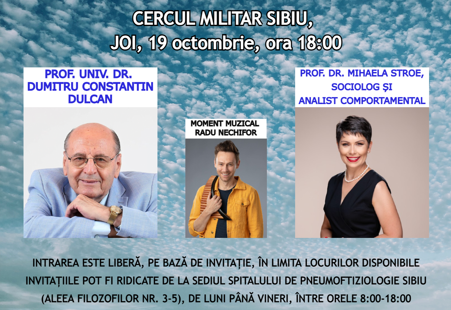 Cetățenii care doresc să participe la conferința „Suntem ceea ce gândim”, susținută la Sibiu de renumitul profesor Constantin Dulcan și de sociologul Mihaela Stroe, au la dispoziție Invitații pentru acest eveniment. Conferința va avea loc joi, 19 octombrie, începând cu ora 18.00, la Cercul Militar Sibiu, fiind organizată în cadrul Zilelor Medicale ale Spitalului de Pneumoftiziologie Sibiu.