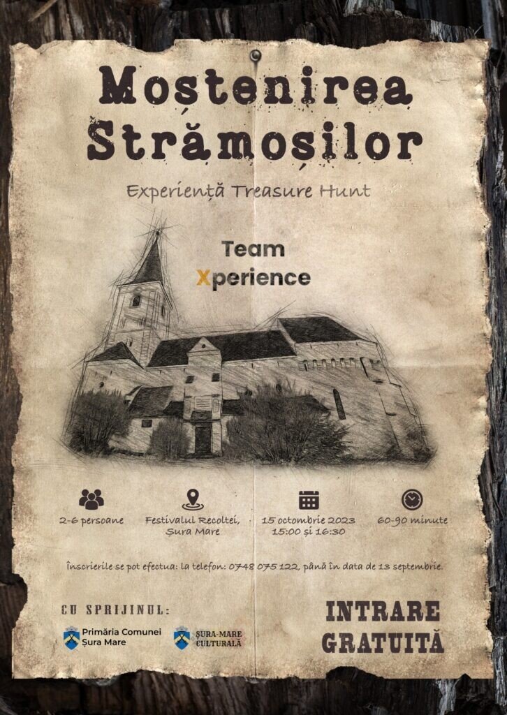 Într-o călătorie de 60-90 de minute, veți explora tainele și poveștile din Sura Mare din anul 1900, ghidați de un testament străvechi. Evenimentul este deschis pentru echipe de 2-6 persoane și participarea este GRATUITĂ pentru toți cei dornici să descopere moștenirea locală.