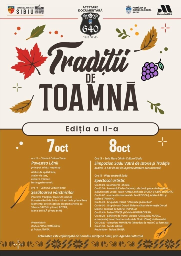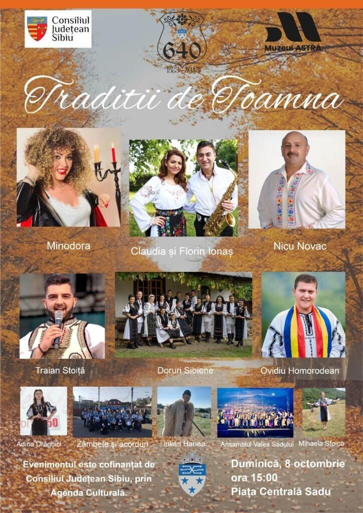 Sâmbătă și duminică (7-8 octombrie), comuna Sadu organizează o serie de evenimente care păstrează tradițiile locului. Primăria a înscris programul pe Agenda Culturală a Consiliului Județean Sibiu. Anul acesta comuna marchează 640 de ani de atestare documentară. Cap de afiș este cântăreața de manele Minodora.